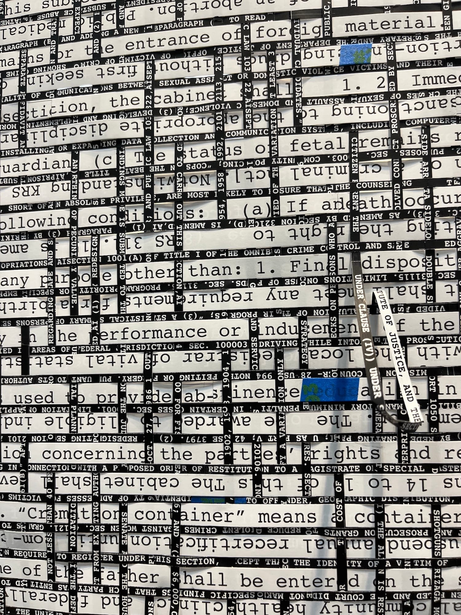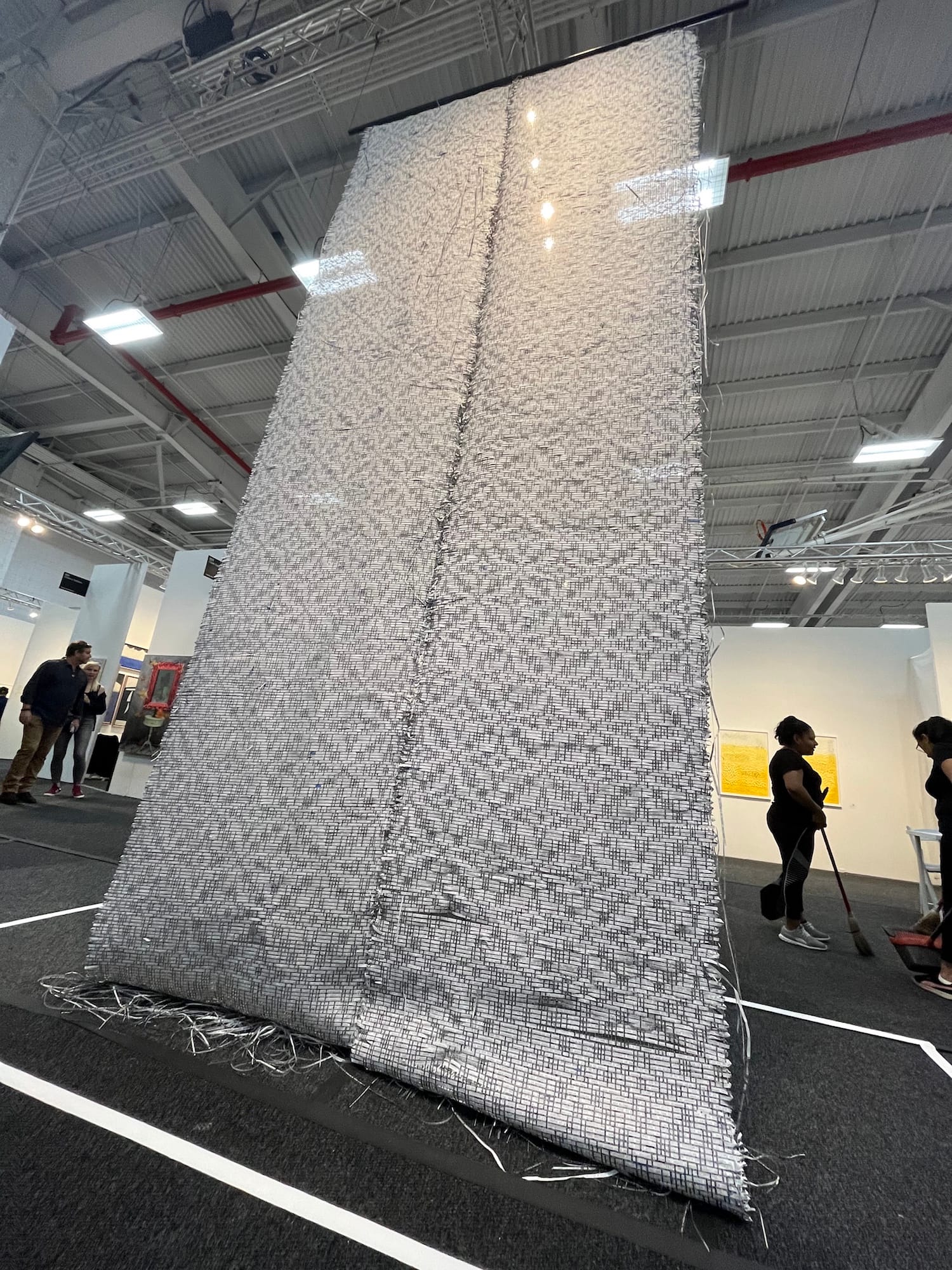 A preliminary survey of the fair gives me my first insight, one shared by several murmuring fairgoers huddled not inside the booths but in the central walkways. The most eye-catching, surprising pieces on first view are sculptural. Draping like a massive gossamer scroll from the ceiling is a tapestry assiduously woven with lengthy strips of shredded paper. Titled "Warp and Weft #05" — a reference to the vertical and horizontal weaving technique that turns thread into fabric — each strip is inscribed with words from crime and welfare bills from the 1980s and ’90s or state bills limiting abortion access. Complementing the paper tapestry is a series of photographs the artist Bang Geul Han staged going about everyday life wearing it in various unexpected ways (i.e., reading with the bamboo mat-like object covering her eyes). Not far away from Han’s piece is a summer-dress-white arrangement of perpendicularly hung labyrinthine cutouts. The maze-like pattern on each sheet in two dimensions, layered against one another and taken together, produces the illusion of infinite recession in three.