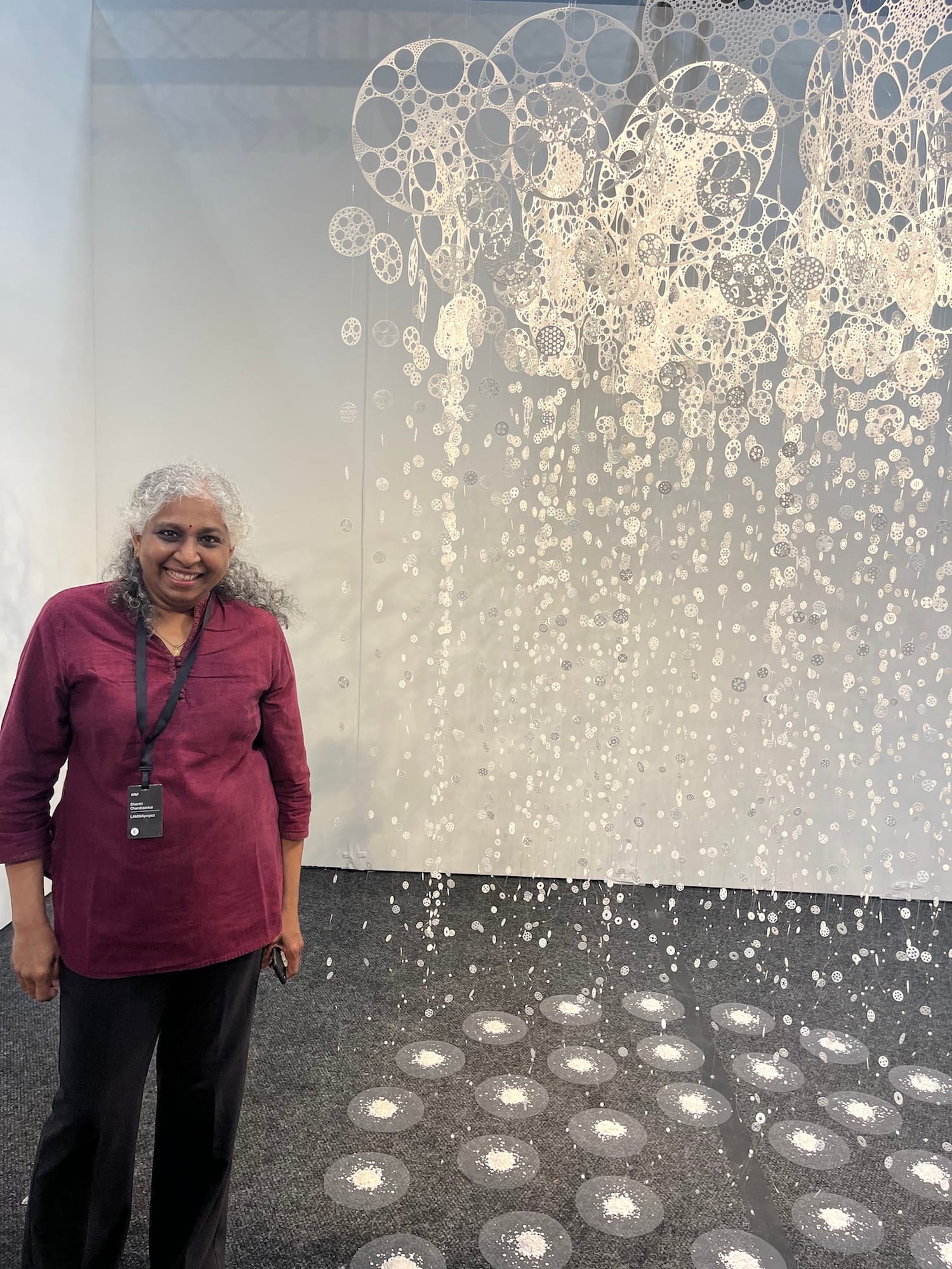 Most impressive to me of the sculptural works is Shanthi Chandrasekar’s "Entropy: Macrostates & Microstates." Near the top of the hanging piece are a set of large circular disks populated with holes of varying sizes. Hanging from those disks are smaller disks made from the punched out holes — and the disks hanging off them subsequently iterate accordingly.