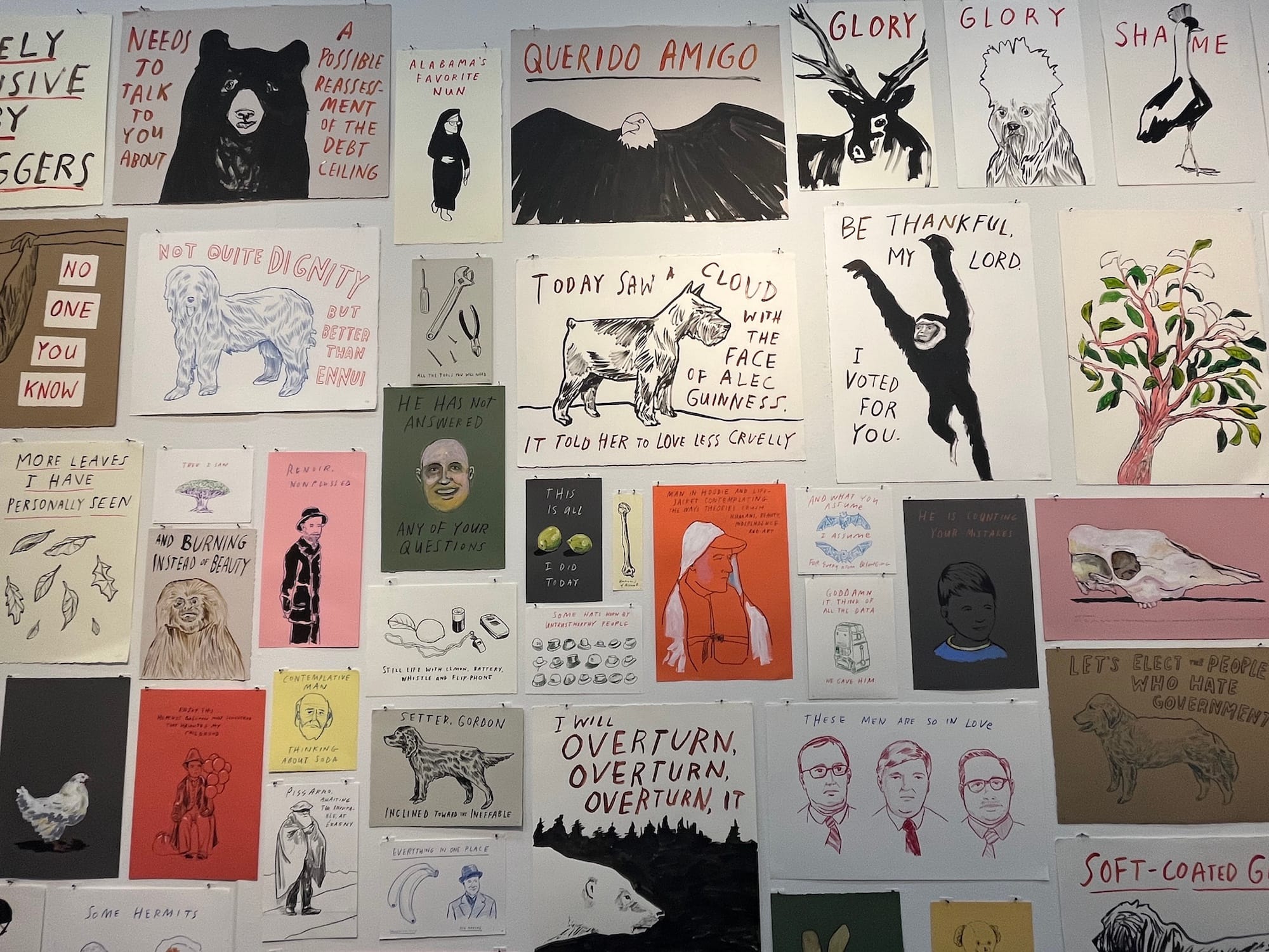 “I’ve seen some drawings from people who are known for doing other things,” he says, before trailing off. But upon seeing Eggers’s visual works, Lang found them “beautiful” and “amazing.” Although many of the posters contain messages that are disturbing and depressive, the viewers who stream in seem largely charmed and humored. I tell a smiling woman taking photos that she looks gleeful.