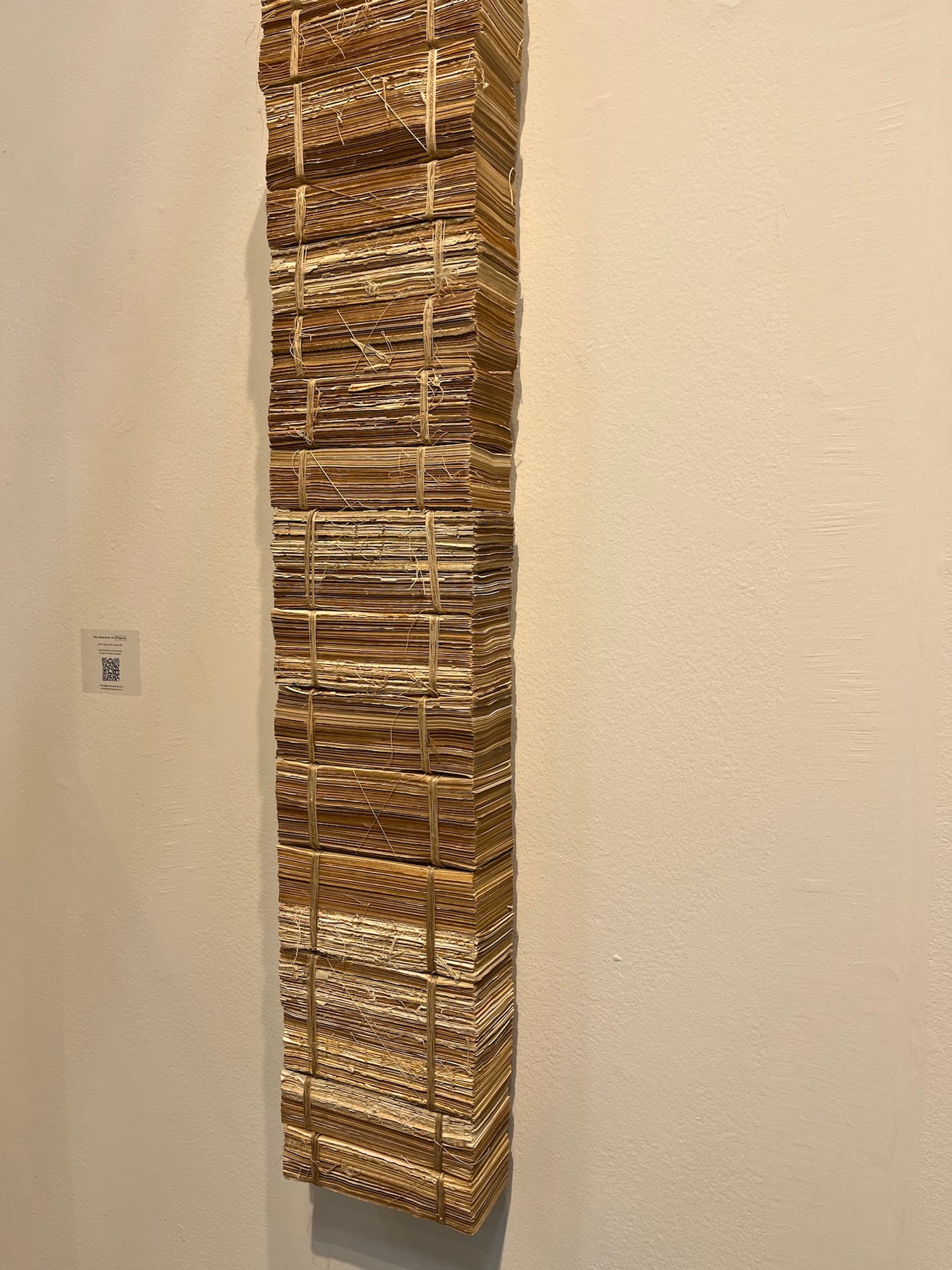 That’s when Art on Paper gifts me a third and final lesson. Out of the corner of my eye, tucked away in a corner of Pan American Projects’ booth, I spot a substantial, vertical stack of yellowing papers bound together with string. It's by José Manuel Fors, a Cuban artist concerned with accumulation, memory, and loss. I am a textual person, so this piece — with its fragility, integrity, and voluminousness — is immediately evocative to me. Contained in these papers is an essential truth about the dignity and futility of salvaging memory from obscurity. Paper is its own demise and the valor of persisting nonetheless. I let go of my anxieties about tracking down all the bad money art — a meaningless enterprise, I see now — and leave the fair, content that an event at Pier 36, of all places, has imparted me with these lessons.