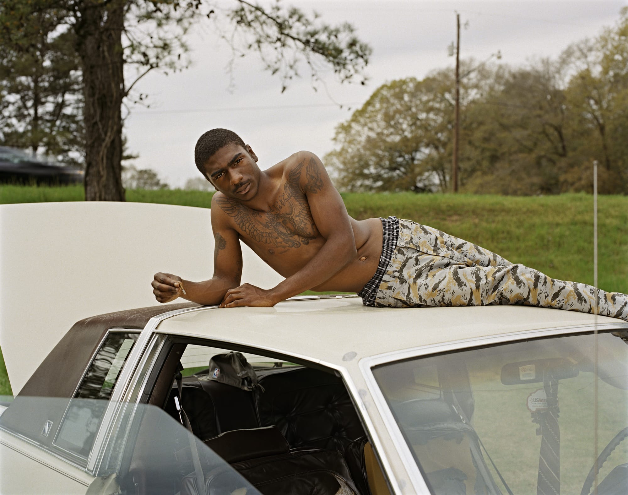I was bowled over when I first saw Deana Lawson’s work in her exhibition, Deana Lawson: Mother Tongue, at Rhona Hoffman Gallery in Chicago (February 28th – April 5th 2014) and have been looking forward to seeing more. In this exhibition she includes photos from three different bodies of work. One of the things that struck me about Lawson’s imagery when I first saw it is the obvious rapport she has with her subjects. In “Cortez” (2016), we see a brown-skinned, bare-chested young man, who is lying on the roof of his car, propped up on one elbow, staring into the camera. He is wearing camouflage pants and plaid underwear, which rises above the pants. His chest is covered with tattoos, along with his left shoulder and part of his upper right arm. There are odd details: the car doors and trunk are open, and a striped tie hangs from the mirror. Like Sepuya and Linn. Lawson invites us to look at everything, not just the figure on the roof. A striking portrait in which the contextual circumstances (or story) are never revealed, “Cortez” is also a study in color relationships: brown skin; off-white car; pale gray sky; camouflage pattern; green grass; and dark brown tree trunk.