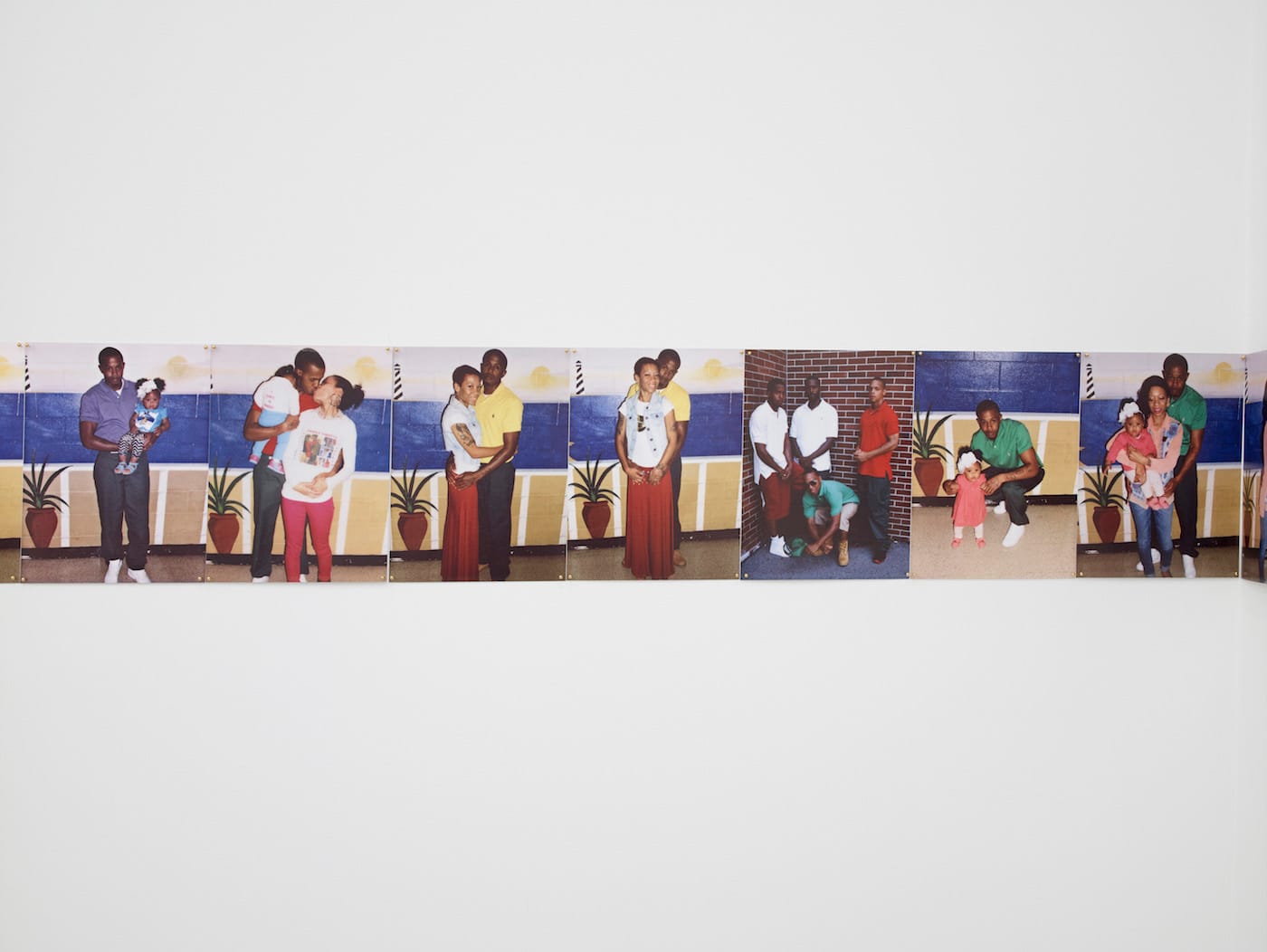 “Mohawk Correctional Facility: Jasmine & Family” (2013) is a series of photos depicting the artist’s cousin, Jasmine, with her partner Eric and their children taken inside the Mohawk Correctional Facility in upstate New York over a period of three years. Covering the period during which Eric was incarcerated, the images were taken by prison officials and document multiple trips Jasmine and her family made together.