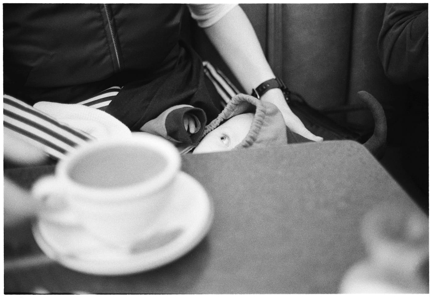 The absurd, however, is not something she looks for. She is open to many possibilities in her work. In “Claire” (1997), Linn has photographed a baby looking up at whomever is cradling her on her lap. We sit where Linn sits, on the other side of a diner table, where the hooded baby’s head is only partially visible. Just above the center of the photograph, the baby’s one unobscured eye stares up at what we cannot see, evoking vulnerability and an eerie otherness.