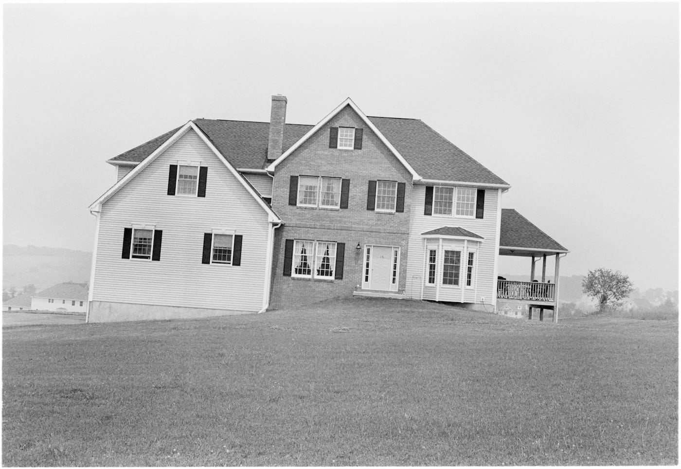 Linn has a sense of the absurd as well as its ubiquity: a house tilted on its foundation, though there is no apparent reason why this happened; a snowy landscape with a mountain range in the distance painted on the garage door of a bland suburban house; a hardy tree branch piercing an empty beer can.