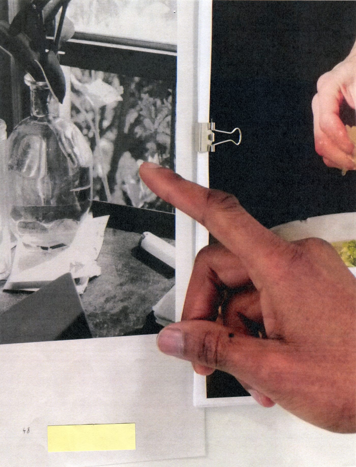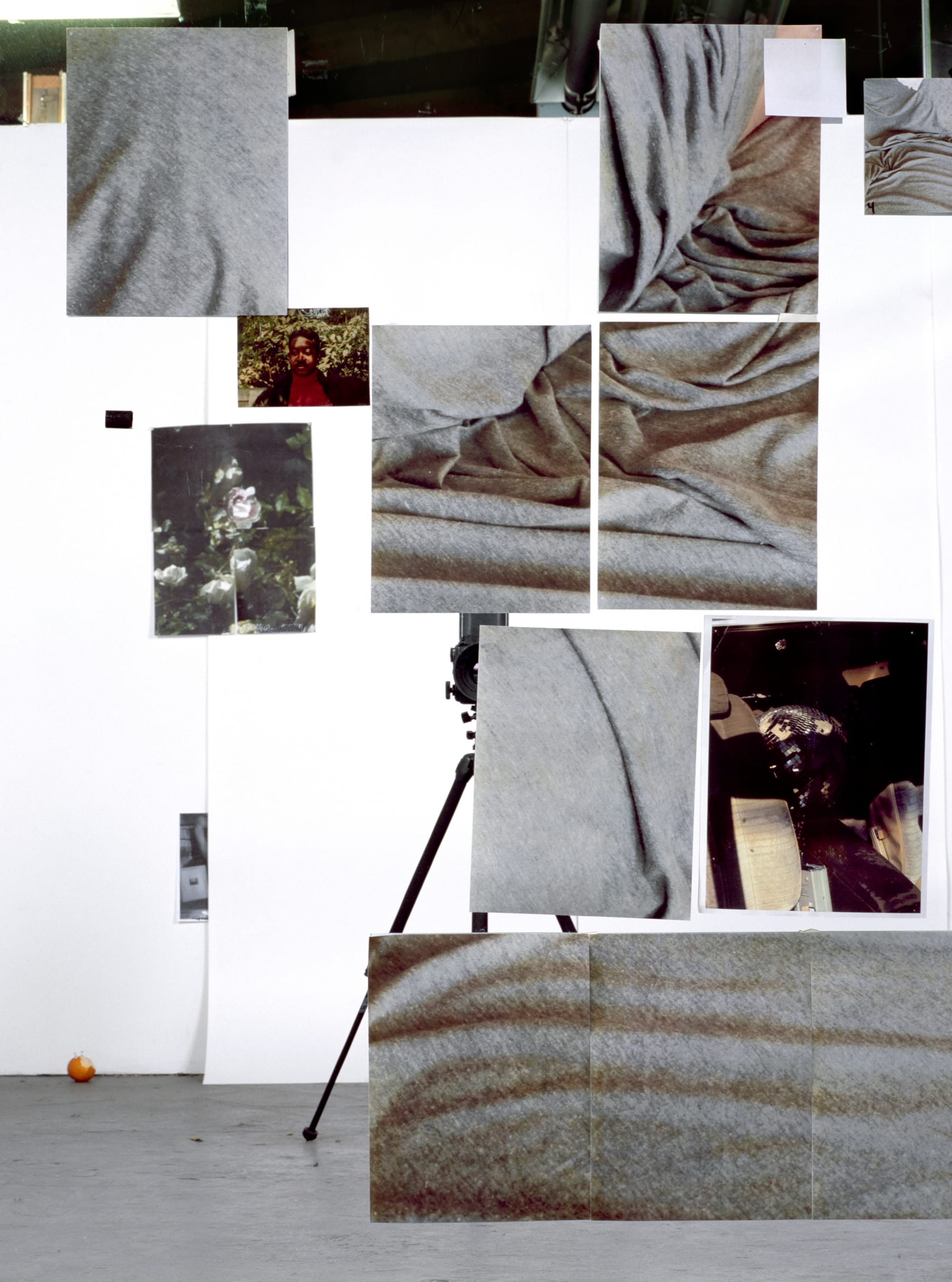 Other than their use of a camera, these photographers appear to have little in common, which I think is a good thing. Paul Mpagi Sepuya is a studio photographer whose work has expanded beyond traditional portraits to include photographs of photographs. In “Enoch, March 24, 2014” (2014), Sepuya has overlaid a photograph of a camera on a tripod, presumably in his studio, with other photos depicting gray bed covering, a headshot, and other details. The industrial grey bed covering — which in some images appears discolored — read as wrinkled and sagging skin, folds of flesh. They are disquieting, but it is hard to nail it down the feelings they evoke further than that. In the studio shot anchored by the camera and tripod, a partially peeled orange lies on the floor, an incongruous detail that invites you to look more closely at every part of the photograph.
