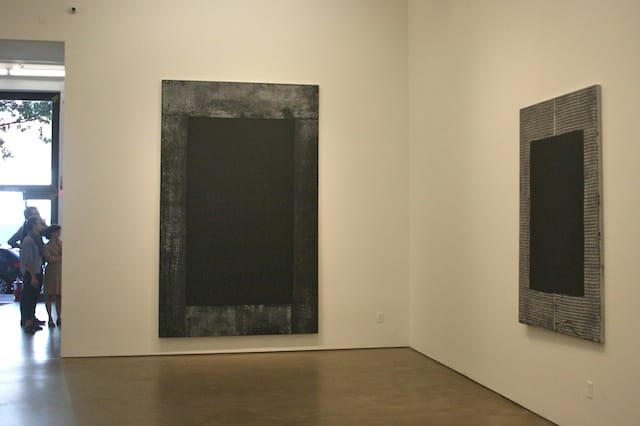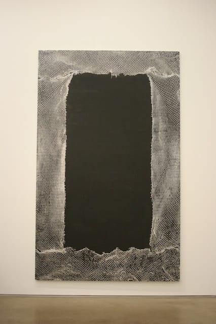 Arranged around the center column are a series of large, non-objective abstractions that look like Mark Rothko canvases painted in a garbage dump. The paintings have dark rectangular centers surrounded by wide frames of white or gray web that look as though the artist used discarded construction barriers as stencil material. They’re strict and foreboding, but even in their simplicity retain a caustic sense of humor. The canvases extend a middle finger to art history while remaining painterly, a tough balance to strike.