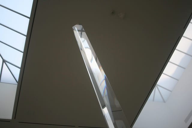 The columns are beautiful objects but they are also anti-objects. The art occurs in the eye, in our newly changed perception and our awareness of how our perception has been shifted by the sculptures. At its core, Irwin’s work has always been about changing perception, from his diaphanous scrim installations to optical-illusion wall pieces. The columns are another beautiful exercise in the same principals, but, particularly given that they were conceptualized decades ago and not executed until 2007, the pieces also feel a little airless and otherworldly. They belong back in that apex of minimalism when it was still possible to believe that a perfect surface could change the world.