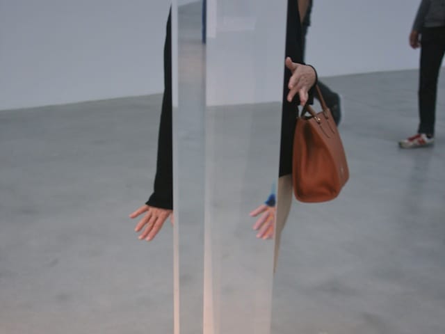 At Pace’s skinny-yet-deep 510 West 25th Street garage, Robert Irwin is showing a trio of transparent columns that don’t stretch all the way to the ceiling but still extend far out of human reach. The columns are created from intersecting prisms arranged like the intersection of two triangles. It’s easier to see the effects of the composition rather than pin the structure down exactly: as other viewers pass behind the columns, they suddenly disappear into blank blocks of light. Seen through the column, gallery-goers are cast in rainbow haloes as they ripple and distort along the acrylic’s glossy surface.