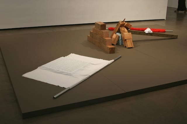 Richard Tuttle’s sculptural minimalism is based on materials that might appear found if they weren’t so perfectly matched. Commercial products, daily tools, and construction materials become fodder for sculptures that balance precipitously between formally successful and unbearably twee. Tuttle’s Pace show at 534 West 25th Street is no different: The sculptures can be aggressively banal, as in one example of a curtain rod with an embroidered cloth over it, laying on a plinth. Other pieces are more dramatic: one large jungle gym-like structure is piled with foam and fiber packing materials.
