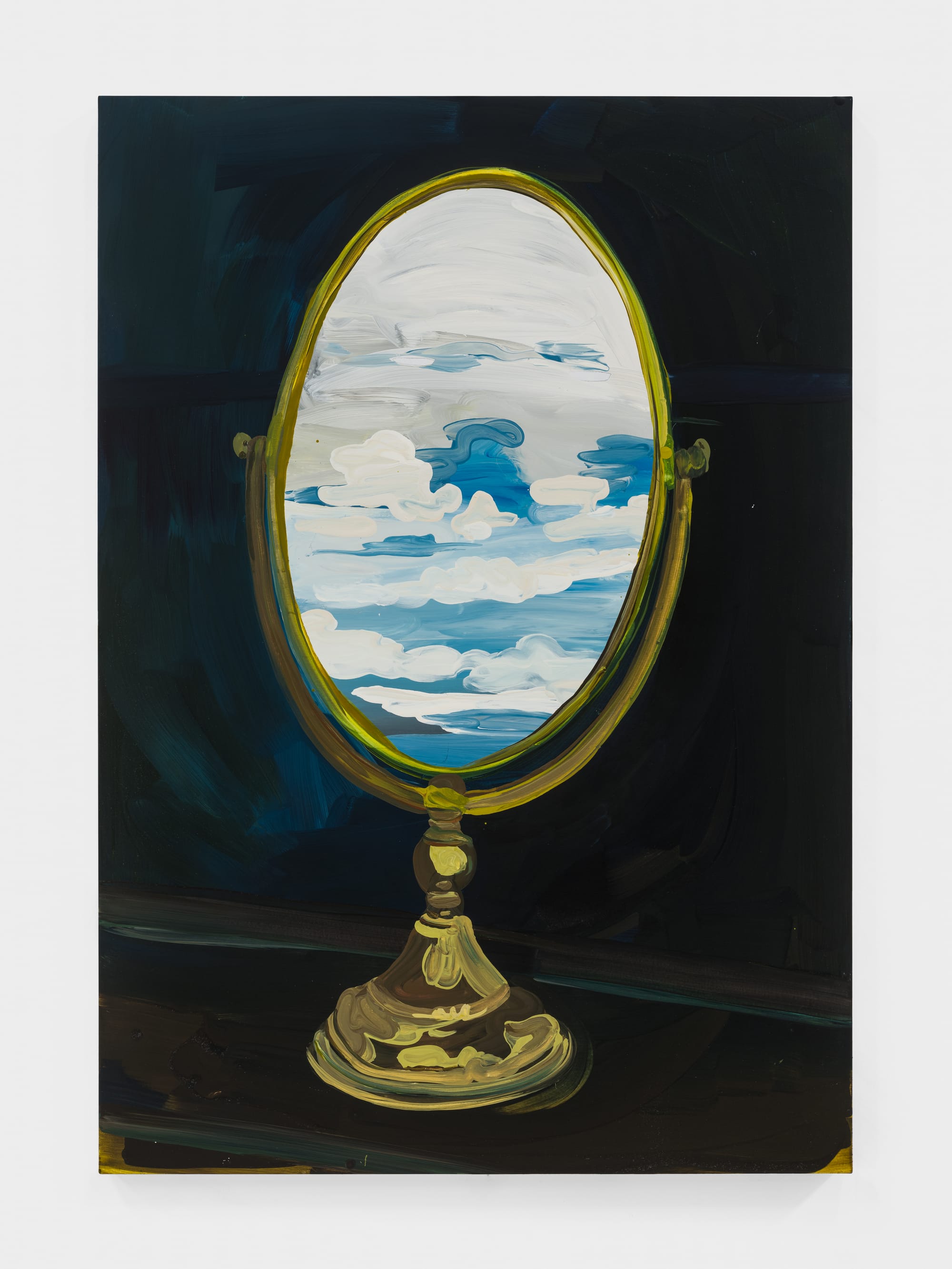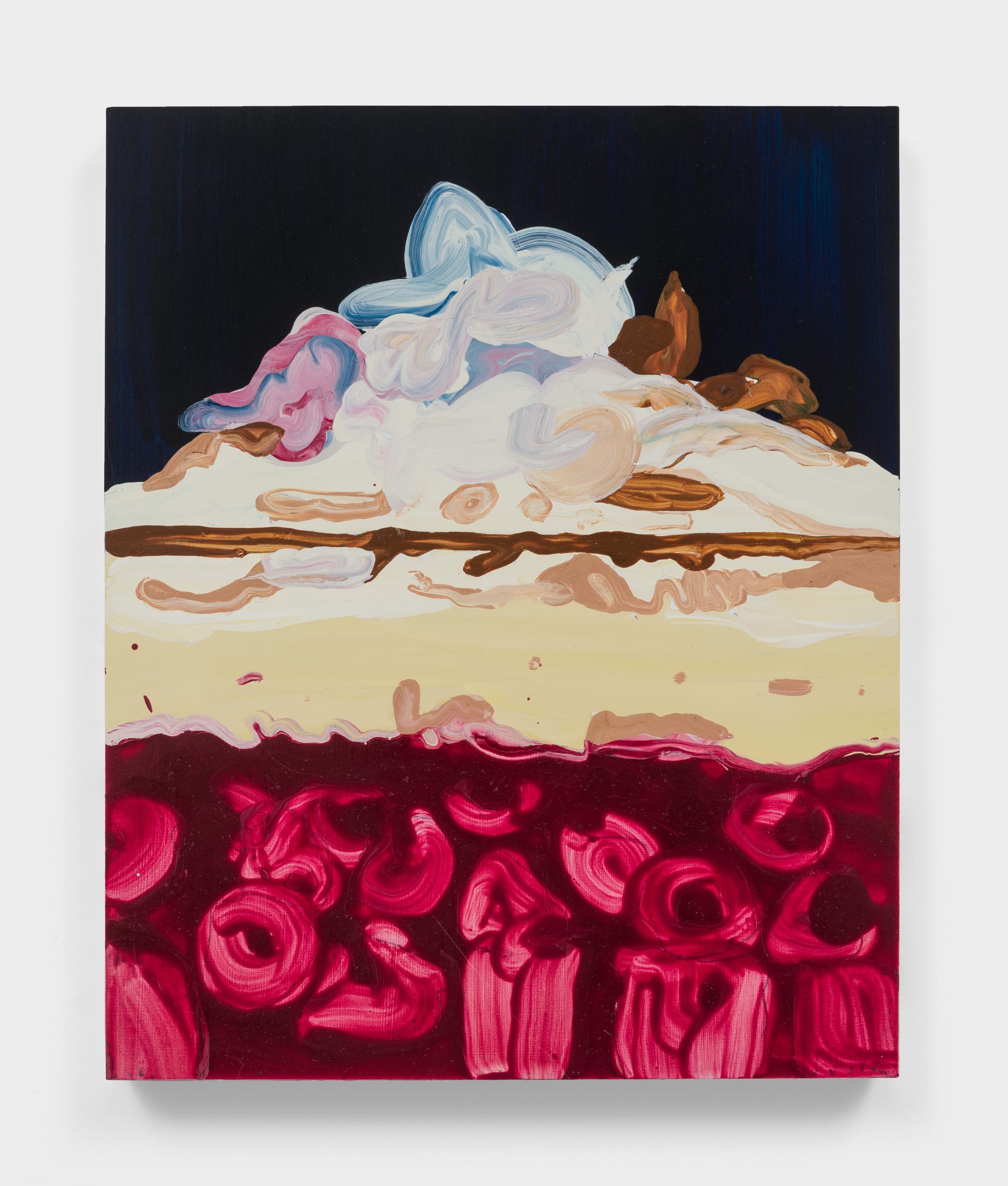 In Woods’s “Time Slip” (2024), sinister-looking black and orange clouds — inspired by images of Russia’s war in Ukraine — move across the sky to turn day into night. The artist depicts clouds in the exhibition’s title painting, “I Blame Nature” (2023), as well, but this time they are reflected in a brass mirror, blurring the distinction between still life and landscape, interior and exterior, to freeze a surreal, Magritte-like moment in an otherwise fleeting world. This effect also occurs in her paintings of sagging faces and desserts, whose layers recall earthen, geological strata. In “Mr Softee” (2023), for instance, soft serve ice cream suspended in clear glass transforms into a snow-peaked mountain, so packed at the center that it appears to be on the verge of an avalanche.