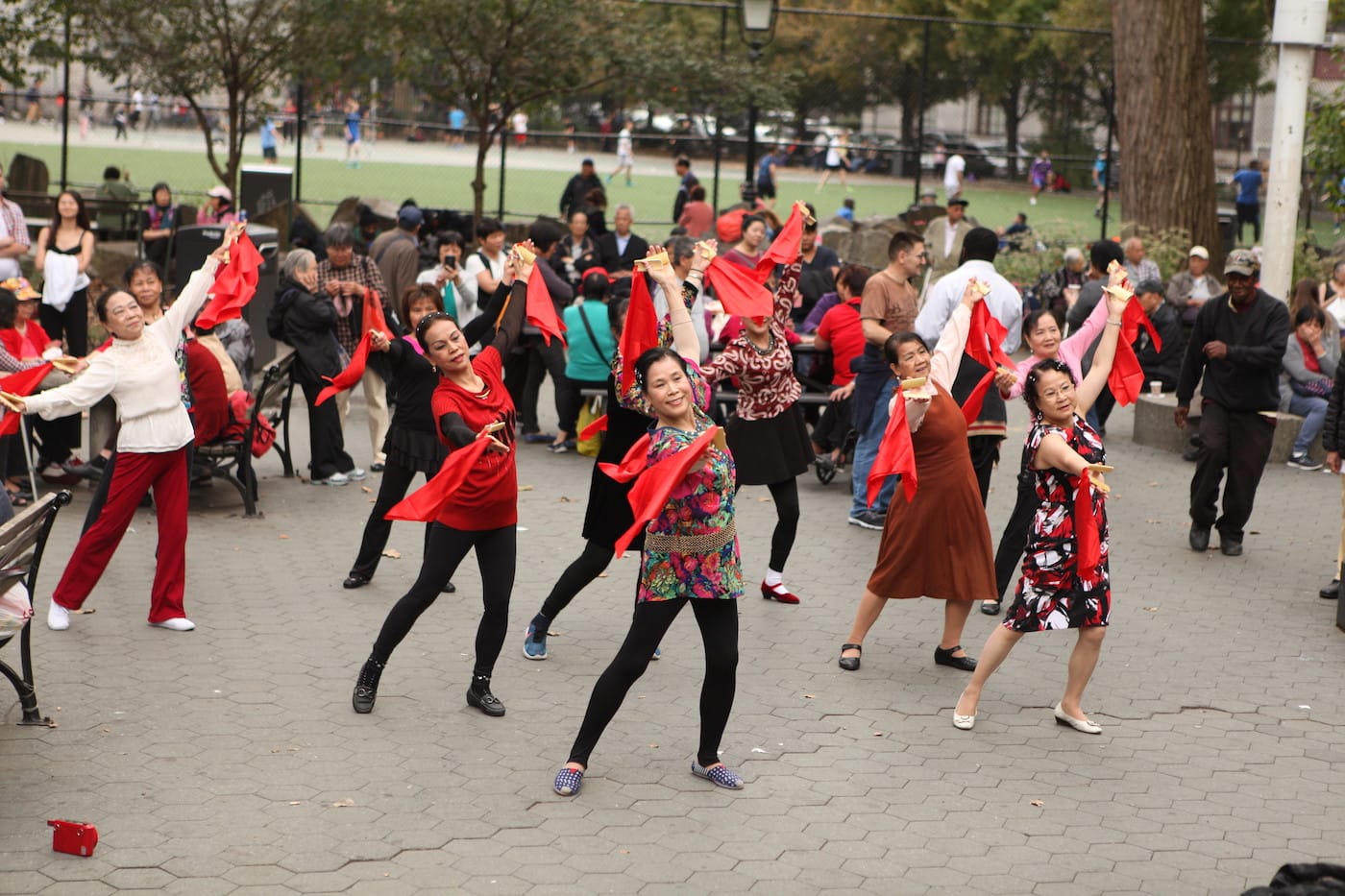 There was also Ng herself performing as a sweatshop worker, doing the dance of folding shirts while dreams of owning her own cheongsam dress shop danced in her mind. There were a dozen elderly women dressed in red, performing a synchronized dance routine to a traditional folk melody in the park, dancing to “celebrate life” and enjoy a freedom of expression that they hadn’t indulged in in their youth.