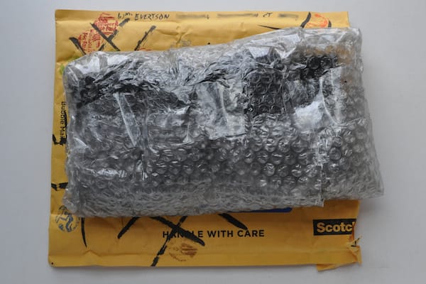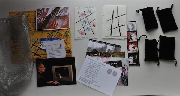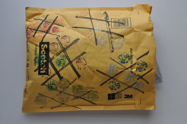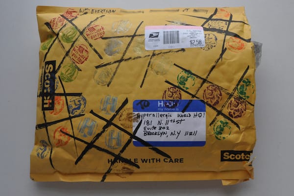 William Evertson created one of the most surprising packages we’ve received for the Mail Art Bulletin. His padded envelope covered with grids and stamps of all kinds, including one that read “Will Work for Food” and another of our Hyperallergic “H” logo, arrived in a bulging package that we couldn’t wait to open.
