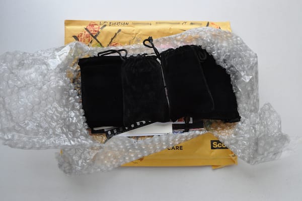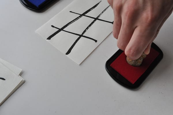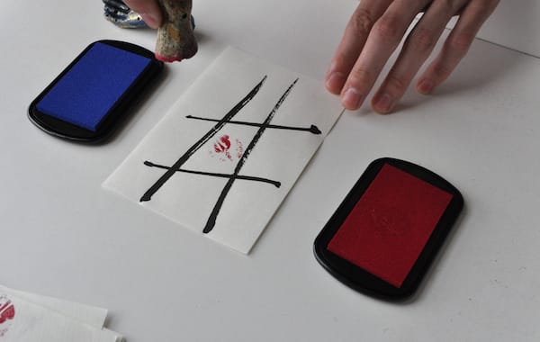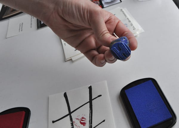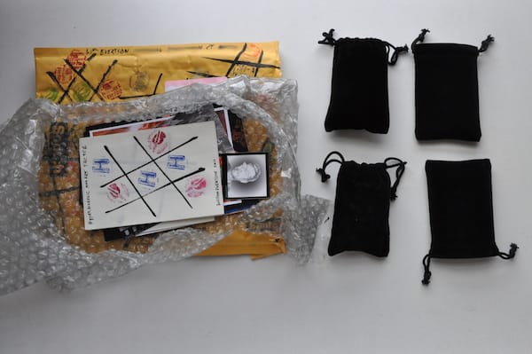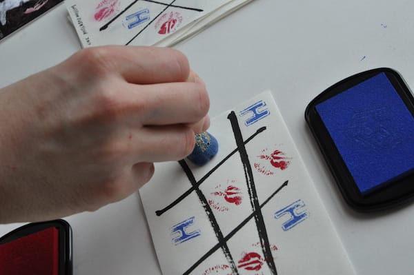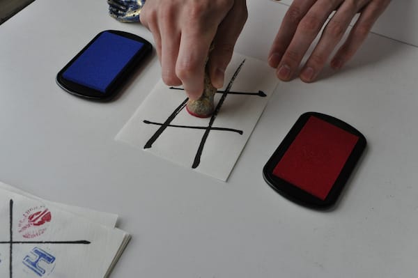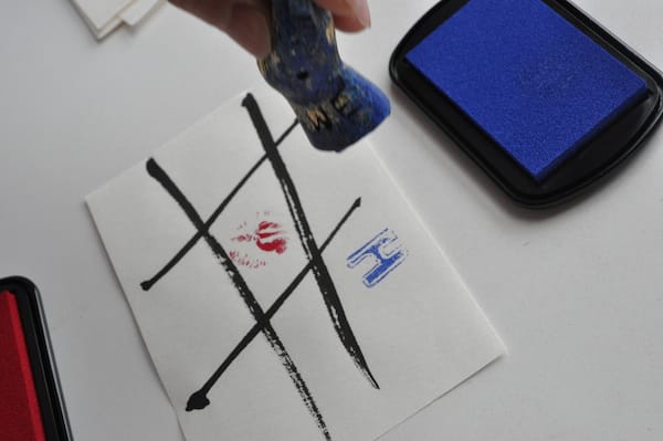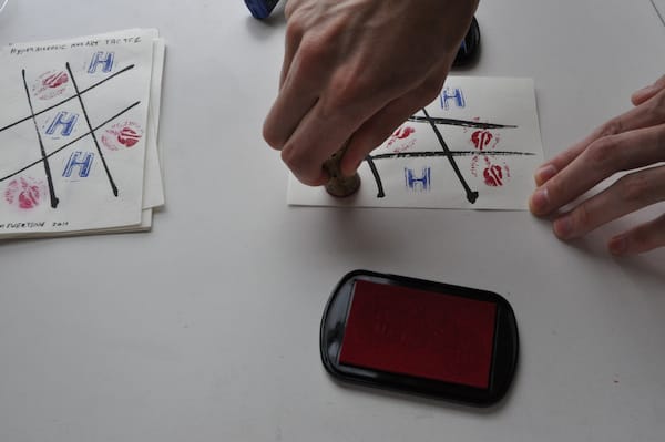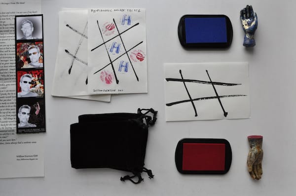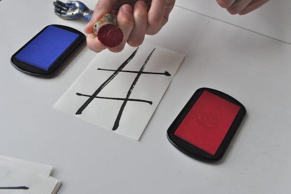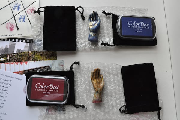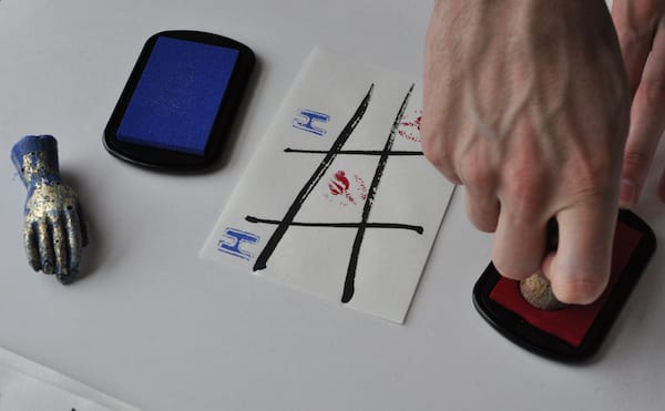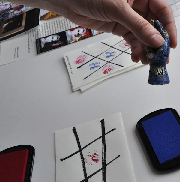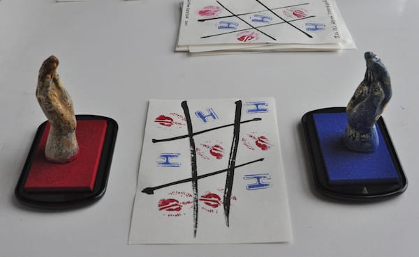Among the paper items were a series of small pages with hashtag drawings that I soon realized were tic tac toe boards. There were four black velvet pouches among the pages, two containing small carved plastic stamps in the shape of right hands and two containing ink pads, one ruby, the other cerulean. I immediately asked Kyle to join me in a small game, which ended in a stalemate.