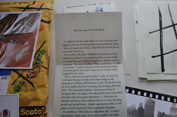 Inside was an array of postcards — mostly from past exhibitions, I believe — cryptic writings, including one that is titled “No Books for the Dead” and ends, “I finally knew when I was dead because I watched it on TV.” Another longer piece of writing is a short story about a man cross-stitching text messages from the dead, even people who died before text messaging was commonplace.