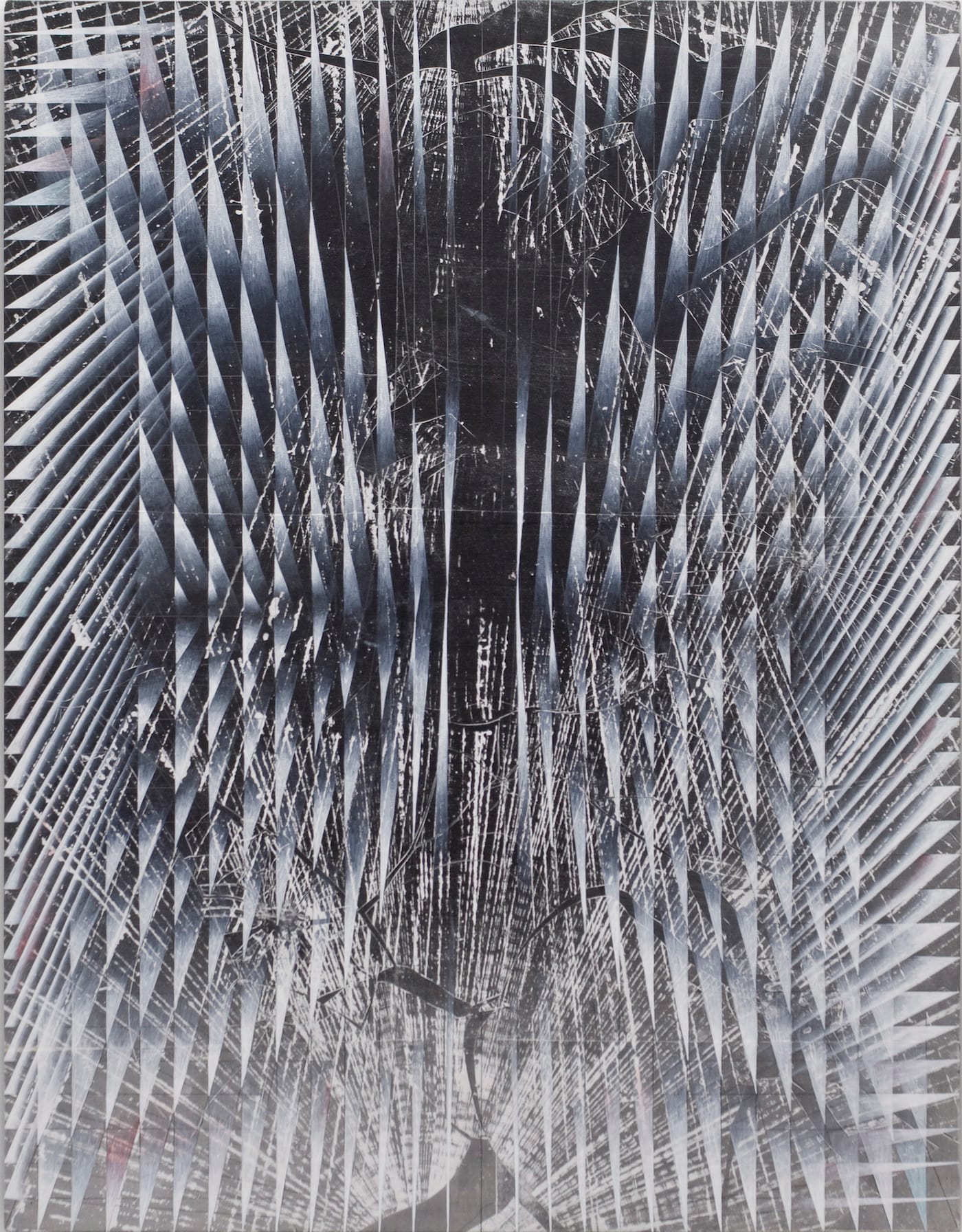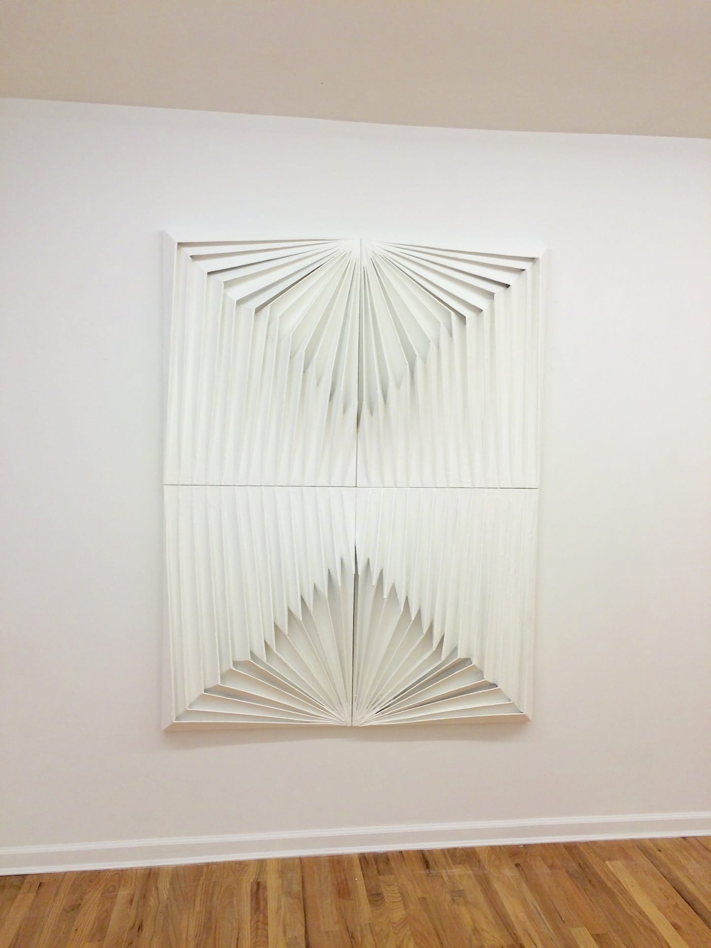 “Ich kaufe mir nur selten etwas neues” (“Late at night, I fall asleep,” 2016), with its accordion folds angling sharply from a symmetrical axis, is a shallow wall sculpture constructed out of cardboard, painted white and mounted on wood. Composed of four sections fitted together, each side mirrors the other, top to bottom and left to right. This mirroring, which is found in nearly all the paintings, speaks to the dissolution of the body through repetition. The symmetrical array of shattered, spiky planes underscores the violence of our past and future — that we live between one devastated condition and another — yet the symmetrical, shattered forms are also emblems of the possibility that all is not lost. There is grimness to the beauty of Kaiser’s forms, and beauty in the grimness.