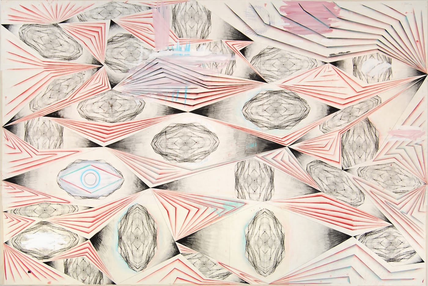 Even so, in “Maden Gehirne” (2010), the largest painting in the exhibition, Kaiser used silkscreen to repeat an abstract watermark, the kind employed to discourage counterfeiting. Over this field of watermarks, he has laid various, sharp-edged geometric shapes made of stepped planes, the edges painted a fading red to suggest drop shadows. Kaiser’s shapes are reminiscent of paper airplanes and Futurist faceting. The watermarks, nestled inside the openings made by the interlocking, sharply angled planes, become blind eyes peering out of the painting at the viewer. Kaiser underscores this reading by overlaying one of the watermarks with concentric circles inside a rhombus. It is a distant relative of the Masonic eye we see on American currency.