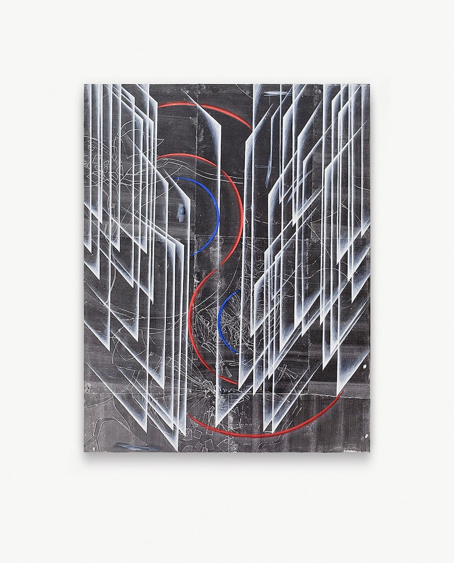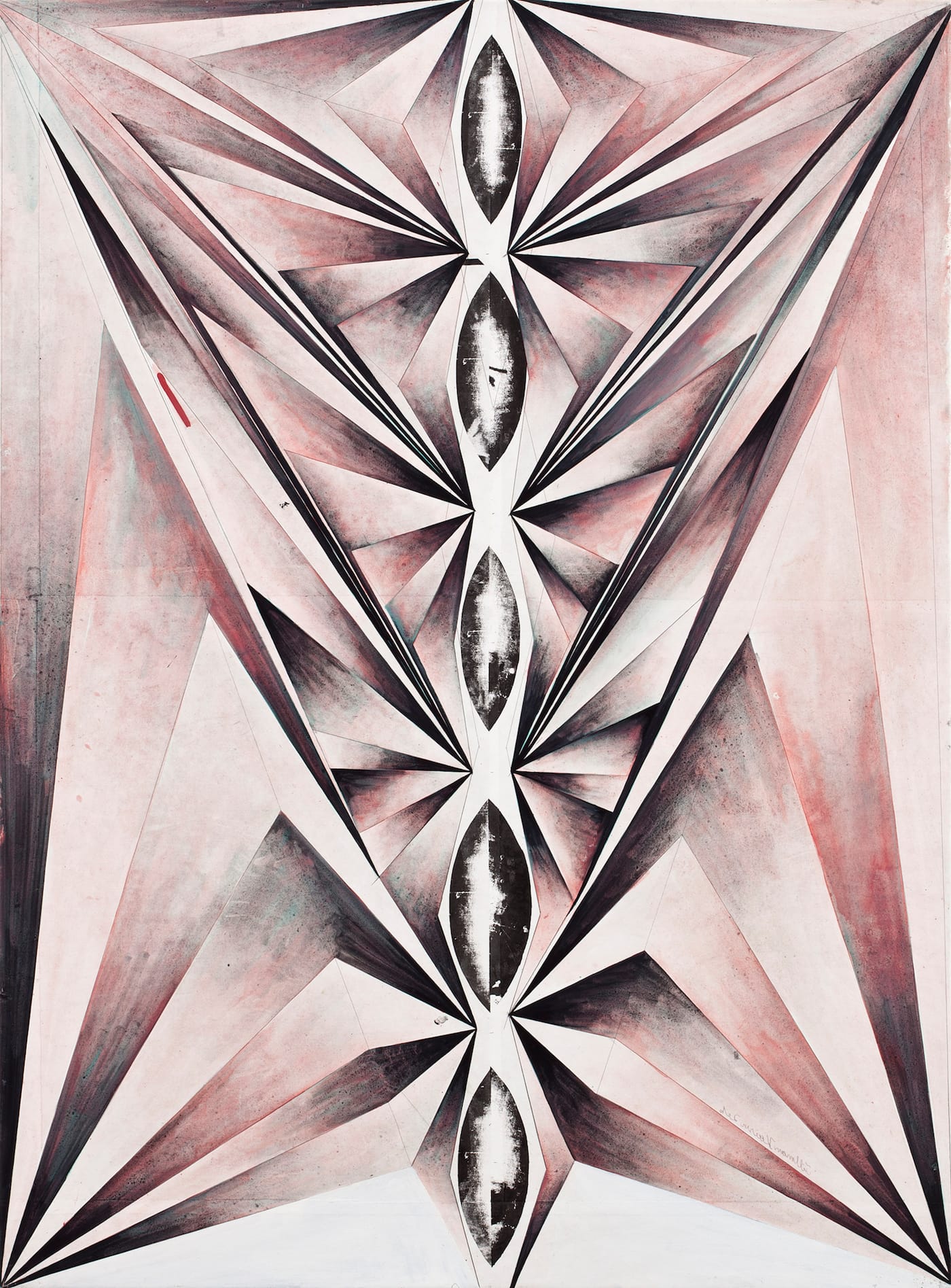 In Screaming Swifts: Paintings and a Construction, at the Mitchell Algus Gallery (September 7 – October 23, 2016), his first one-person exhibition in New York, Kaiser employs a straightforward approach, a muted palette of pale magenta, black, and white, and an efficient directness of paint application, fitting a symmetrical form made of sharp-edged planes and triangles tightly within the painting’s physical borders. The form — which ranges from transparent planes in “Amerika” to a severely angled, relief-like structure in “Shrinking Corners” (both 2016) — defines a compressed space or overlays one that is depthless and dusty. Kaiser’s forms are evocative of shapes found in the paintings of František Kupka and Arthur Dove; the designs and architecture of Peter Behrens; and the gothic futurist sets of Fritz Lang’s film, Metropolis (1927). They feel neither utopian nor optimistic, nor do they recall a heroic past.
