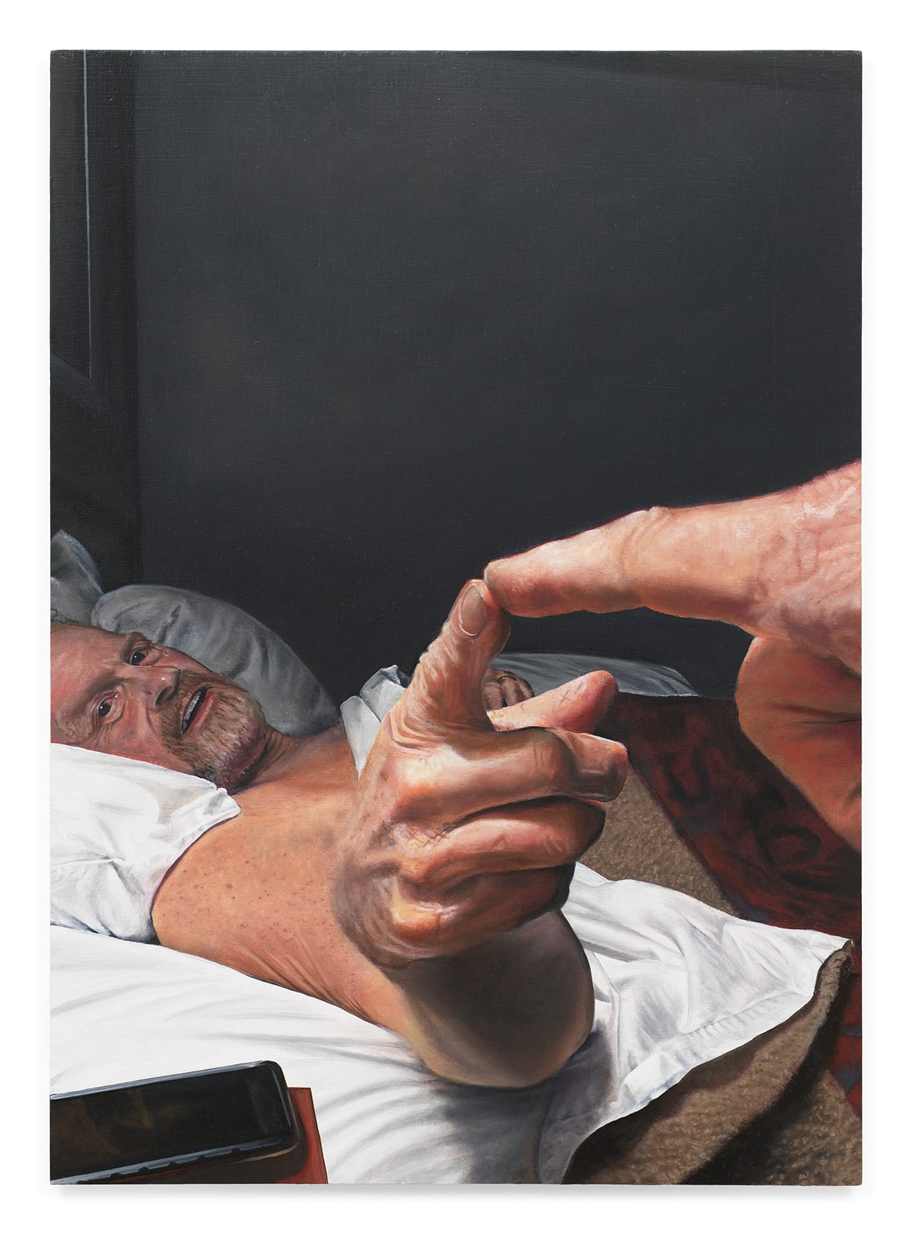 Hawkinson’s love of perfected details and smooth surfaces aligns him with Northern Renaissance artists such as Hans Holbein. Like Holbein, Hawkinson does not idealize his subjects. In “Wake” (2022), a forefinger extending in from the painting’s right edge touches the that of an unshaven man lying in bed against a black background. The two fingers meeting brings to mind Michelangelo’s fresco, “The Creation of Adam,” on the ceiling of the Sistine Chapel, but in its realism the painting is closer to Holbein. In “The Creation of Adam,” God does not quite touch Adam’s finger.