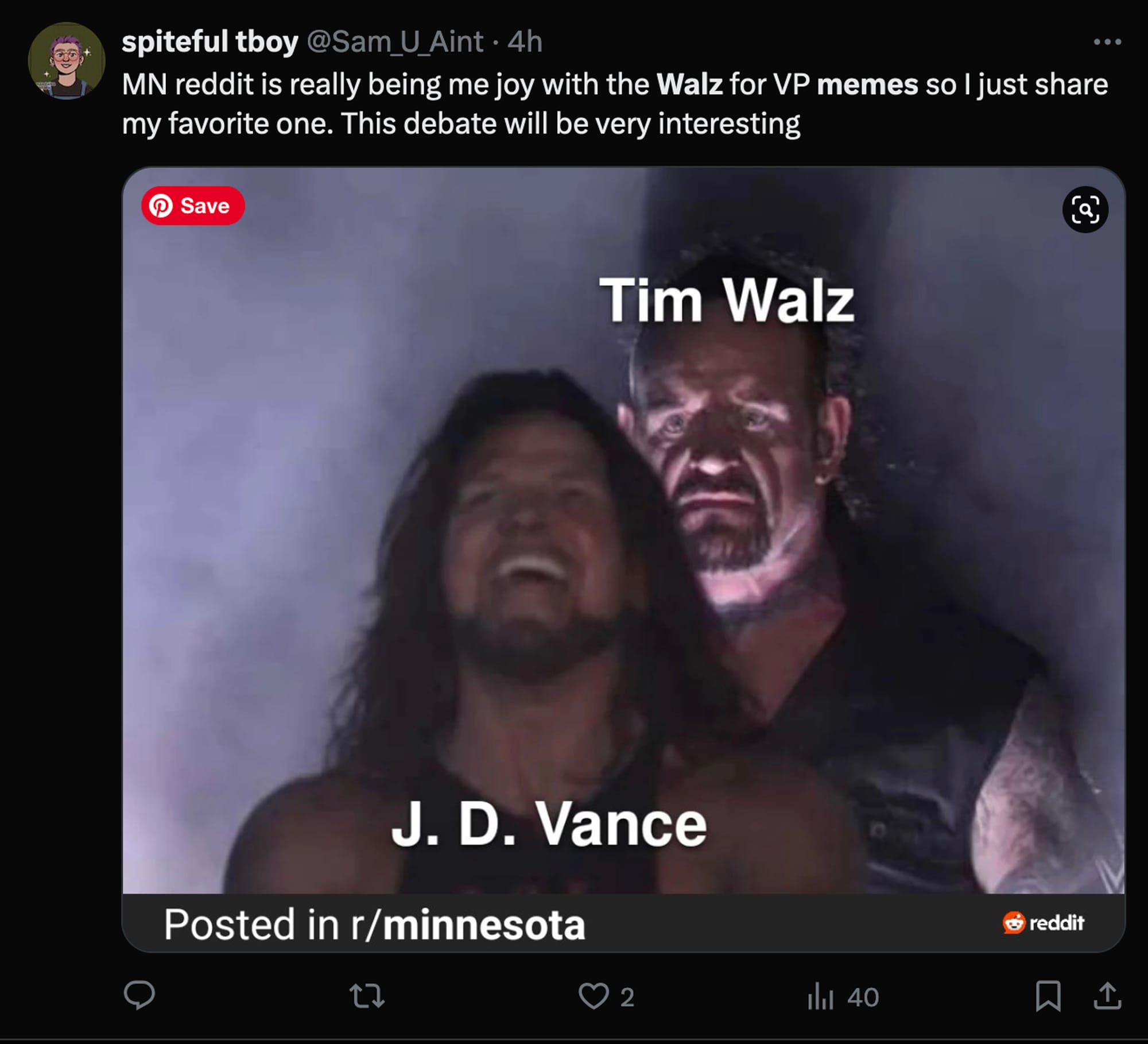And it's clear his home state is ready to turn up and turn out for their rising star. The subreddit r/Minnesota burst onto the meme scene with a WrestleMania classic: Tim Walz about to absolutely crush a JD Vance caught unaware.