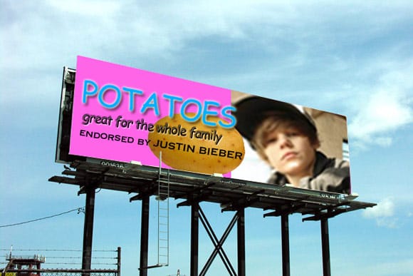 But suppose potatoes become endorsed by Justin Bieber for some weird reason, and they become the hottest ingredient in town. Kids and teenage girls go crazy over french fries (I know, it’s a stretch), hash browns, baked potatoes, perogies, potato chips, you name it. So I paint my sign in bright colors, slap some Comic Sans on there with a blown-up pixelated image of Bieber’s face that I found on Google Images.