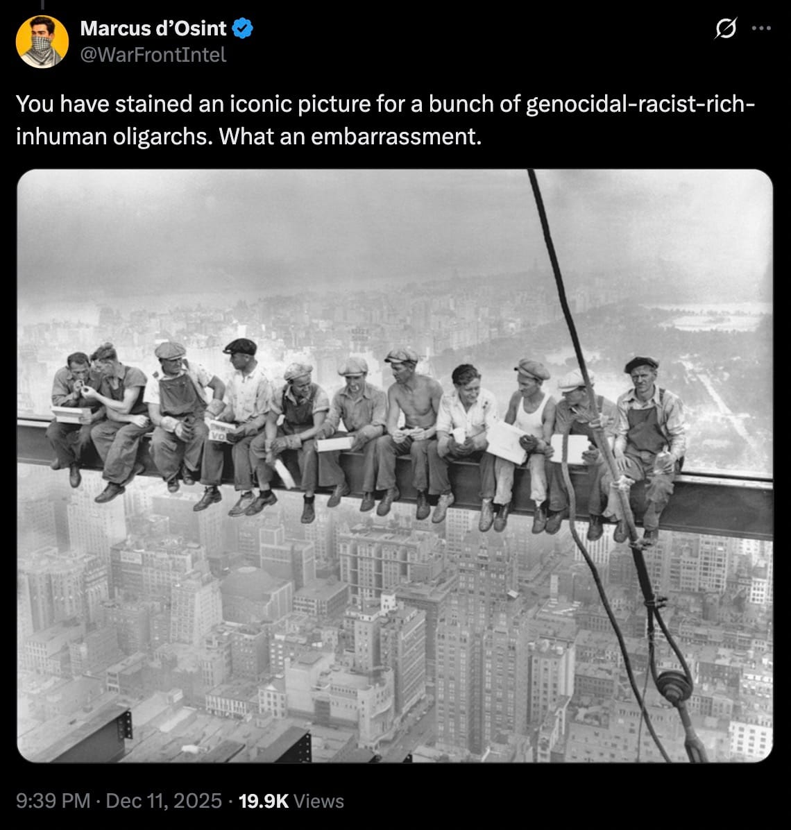 The tech oligarchs, decked out in sports jackets and cardigans with laptops and iPhones at the ready, look self-important in their superimposed positions along the beam, talking past each other or interacting with nobody in particular while suspended over the cityscape. Regardless of how each of them got their beginnings, these “Architects of AI” are as far removed as one can be from the grease, metal, and casually life-threatening labor depicted in the original photo — rather, they reap disproportionate benefits from the contemporary equivalent of said exploitation.
