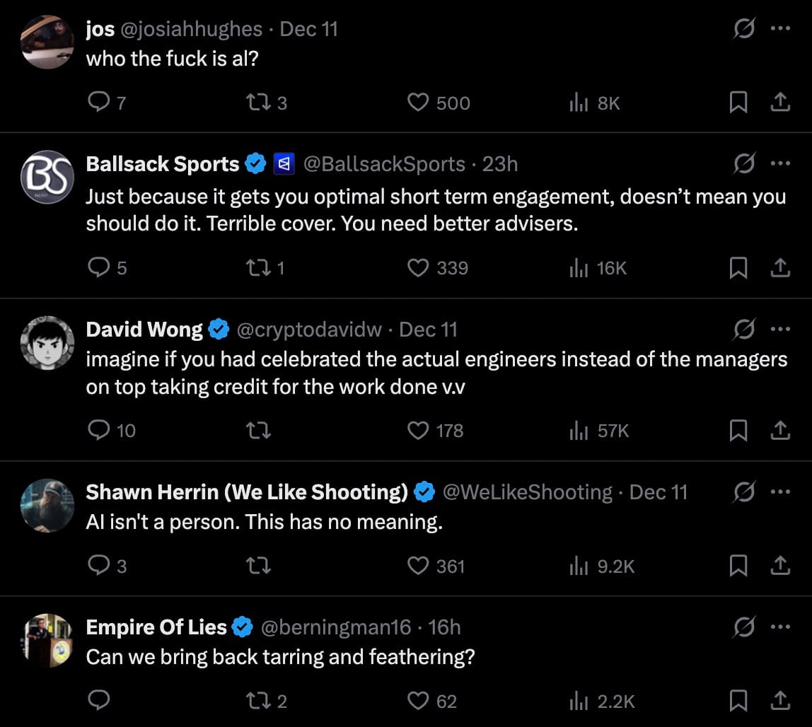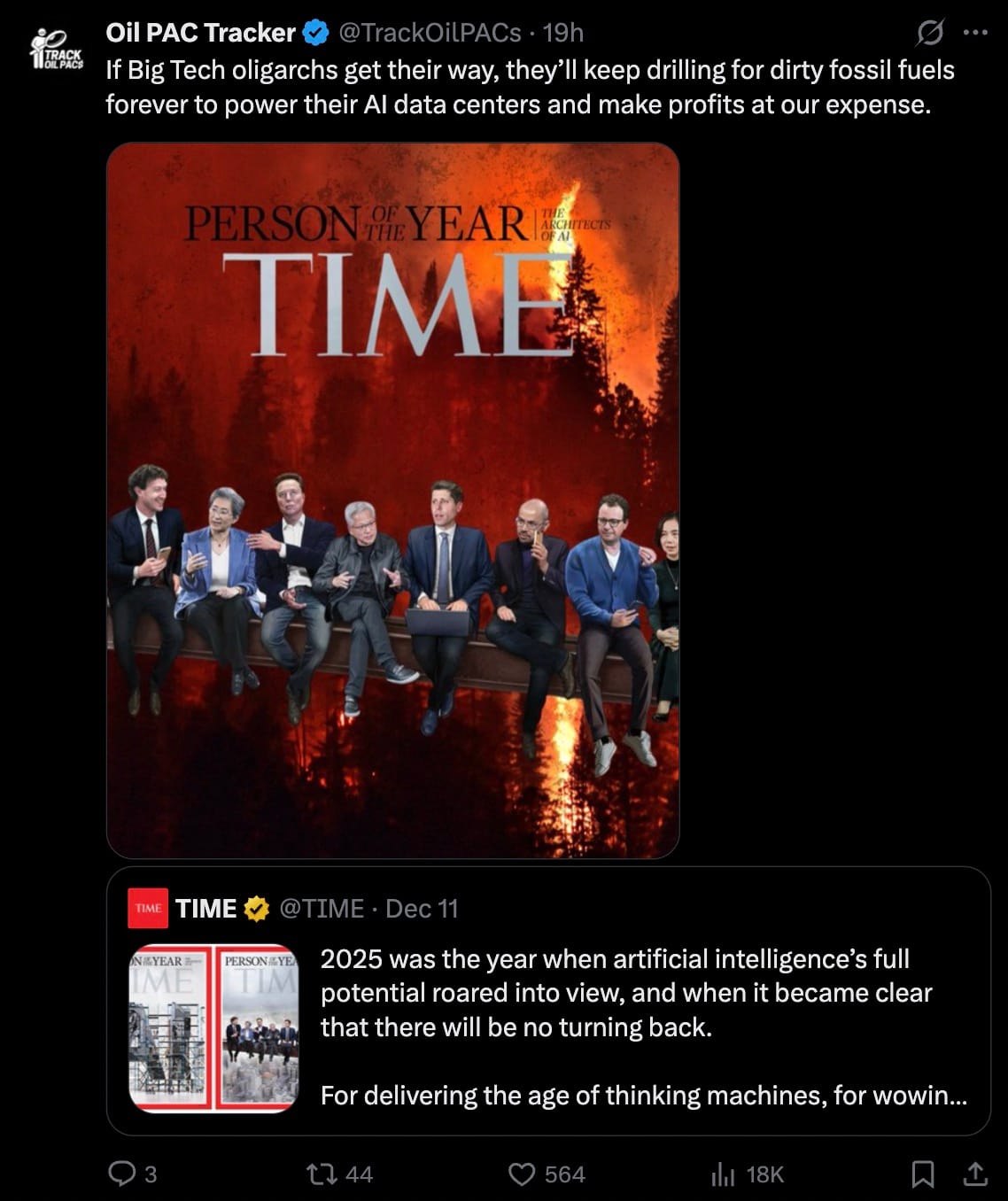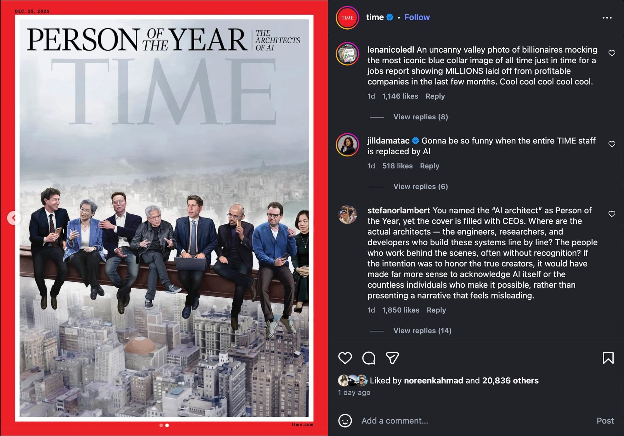 Netizens across the world have expressed their disgust with the cover, denigrating it as ragebait, a mockery of the “most iconic blue-collar image of all time,” and a “puff piece about the rich people destroying our world.” Many also argue that TIME and Seiler only ingratiate the figureheads who already take all the credit for the AI boom rather than the engineers, scientists, researchers, and other actual “AI architects” responsible for developing the rapidly evolving technology.
