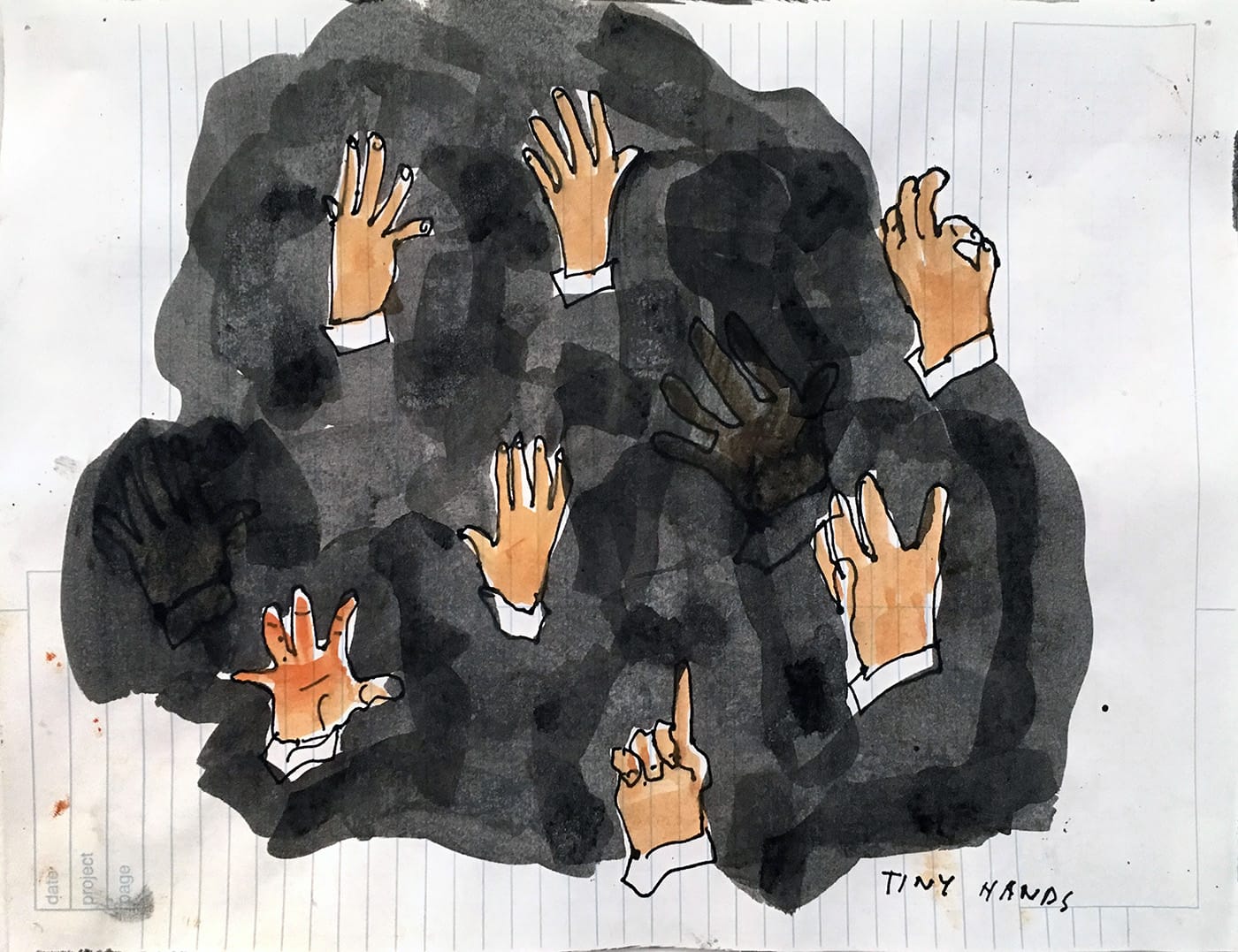 The President’s hand size becomes a full blown social meme obscuring the true downsizing of government and the infantilizing of appointed and elected officials. Tiny hands evoke at once the diminishment of the presidential office and the powerlessness of a disenfranchised electorate. On my college campus only 11% of students voted in the last election. We need to work to make tiny hands into many hands.