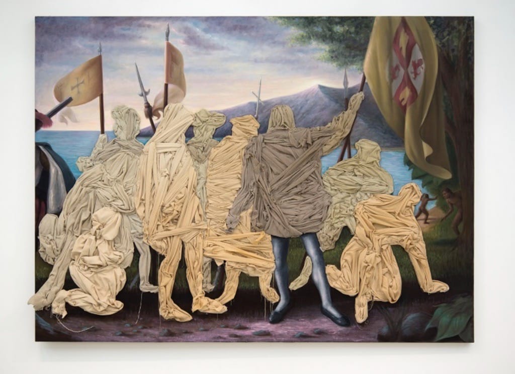 Titus Kaphar, “Columbus Day Painting” (2014) oil and mixed media on canvas (courtesy Dr. Robert B. Feldman)