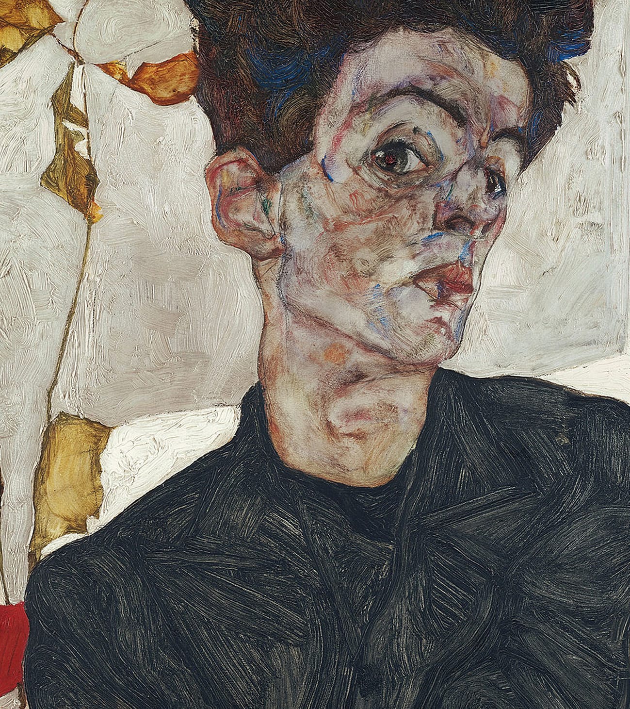 In the Leopold Museum, Hübl gives some backstory behind Scheiele’s “Self-Portrait with Chinese Lantern Plant,” pointing out the power in Schiele’s direct eye contact and the cultural subcontext behind the self-portrait. He then turns to the AI rendition, which shows an angsty cat dressed in a black blazer.