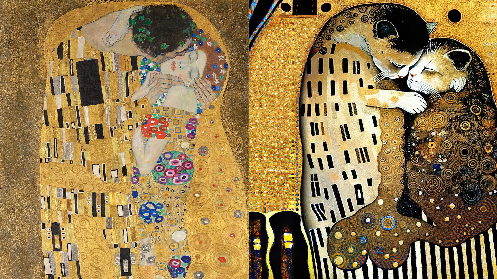Then he turns his attention towards the AI version on a tablet. Like the original work, the cat rendition features two figures, each emanating opposite energies while entangled in a passionate embrace. Except instead of a human couple, this painting consists of two kittens.