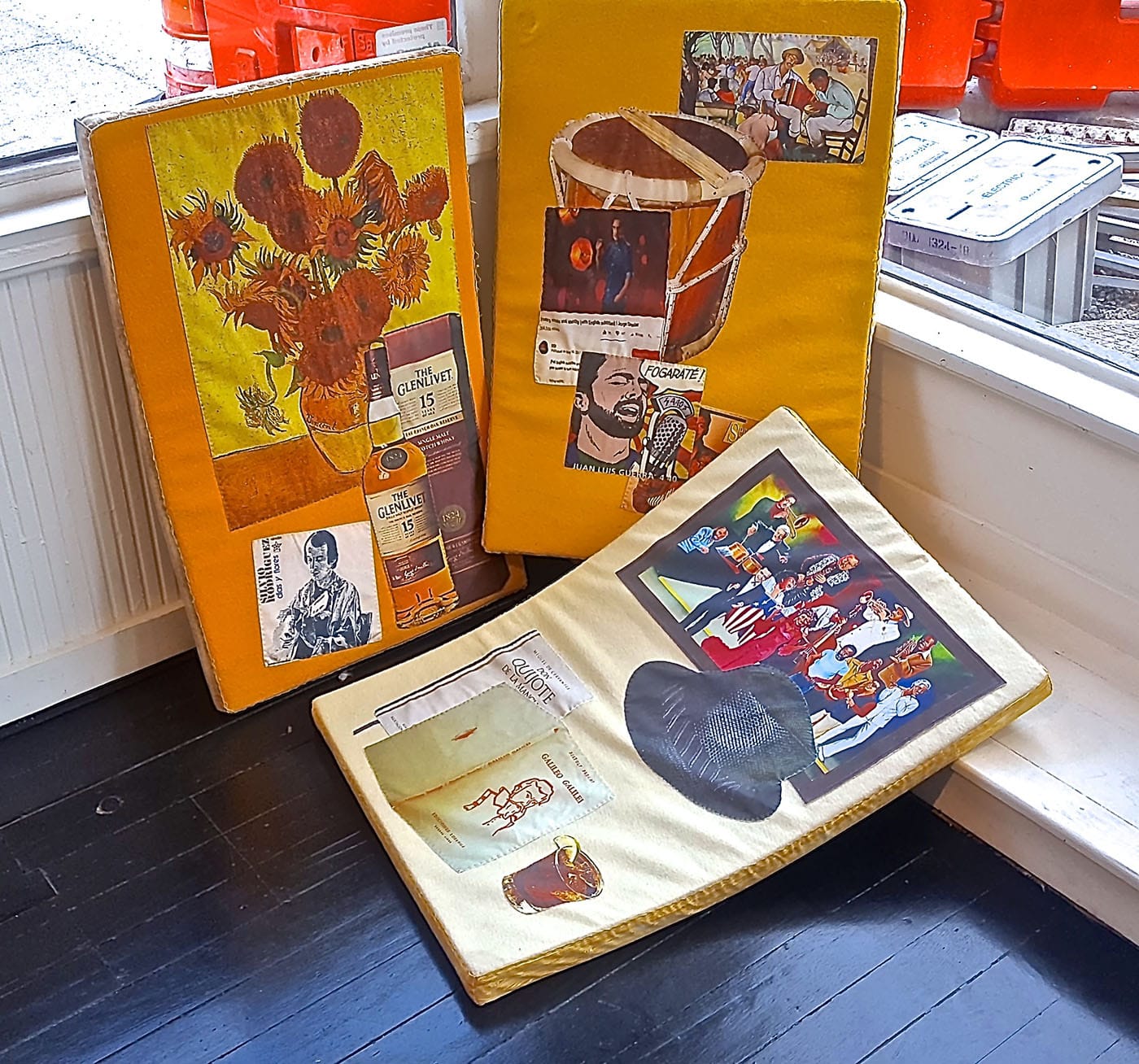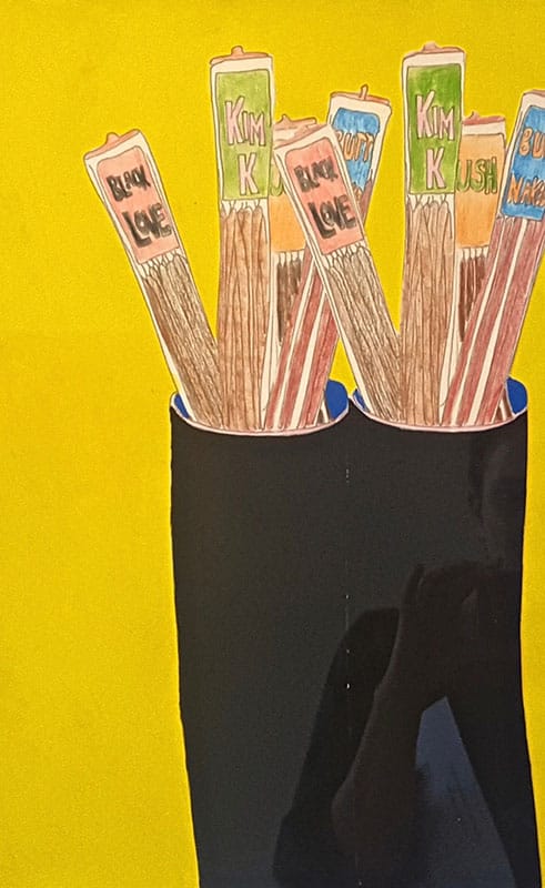 Through a series of eclectic choices, Gumby extends his cohort beyond a sense of kinship — which is ultimately a compulsory kind of relationship — into an air of riffing and conversation more characteristic of friendship. From Lucia Hierro’s digital print collages mounted on felt pillow-like canvases that were expressly forbidden from being hung on walls, to a partition by Eric N. Mack, comprised of pegboard panels embellished with rope and acrylic, to a series of hanging blown-glass ornaments containing evocative hand-stitched iconography by Leslie Jimenez, and Tschabalala Self’s loose, figurative study of cans of incense, there is a feel of abstraction on the edges of everyday objects. This kind of culture-bending is, arguably, owed its own chapter within the mapping of the avant-garde, a kind of remaking and customization of Duchampian readymades; a different approach to cultivating the stuff of life to the stuff of art.