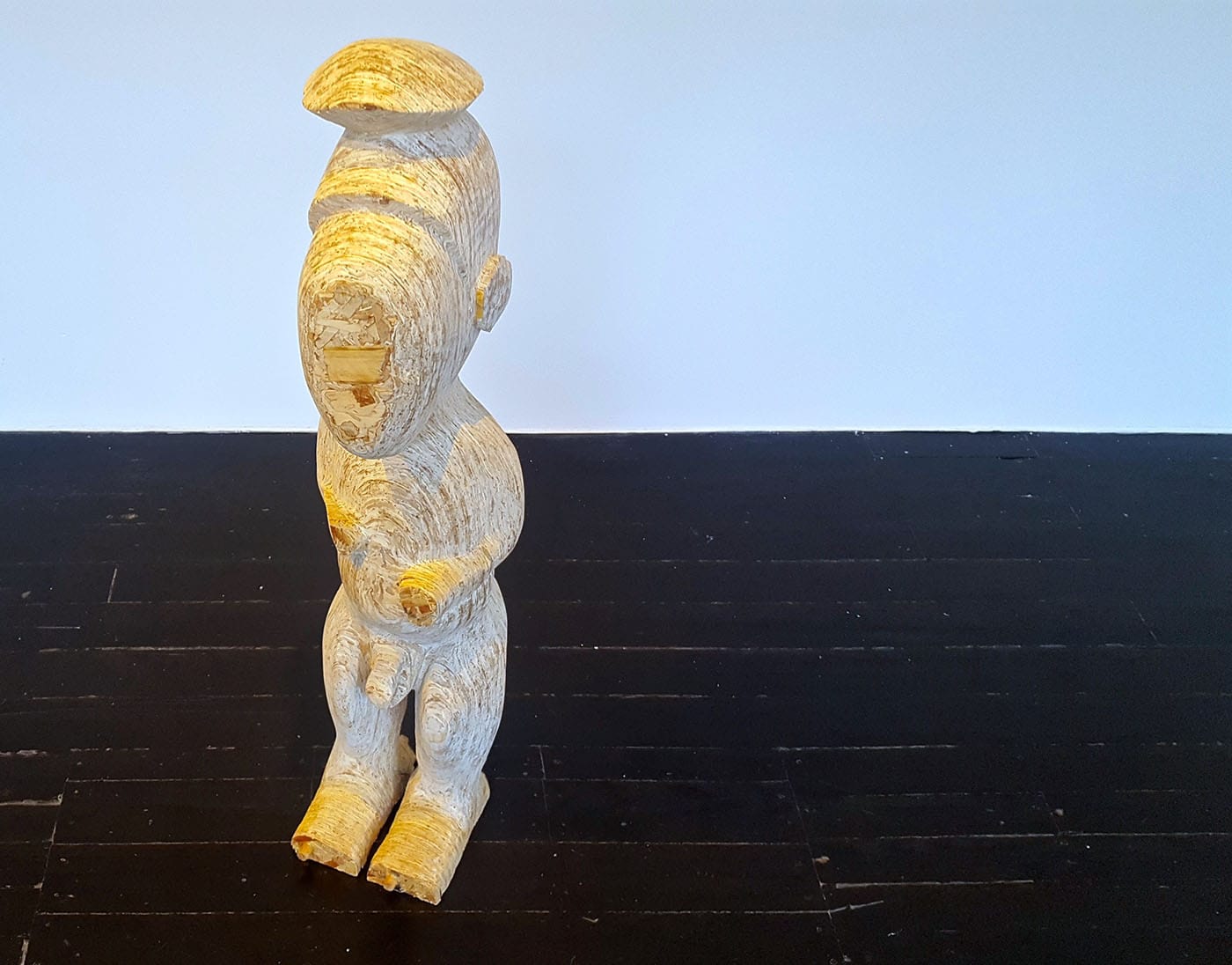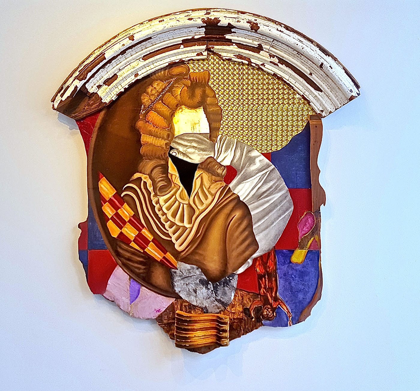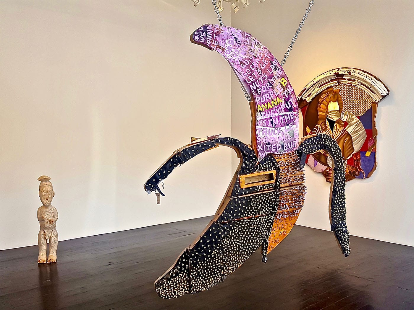 Other works tap and warp cultural history more directly, like Hugh Hayden’s carved wooden statuette in the style of vintage statuary of Burkina Faso and other African traditions; one of Fowler’s eye-catching multimedia works that resizes and re-contextualizes hip-hop style bling as a giant hanging pendant; and of course, Ringgold’s jazz and dancehall scenes, rendered quilt-like on canvas with pieced fabric borders. Perhaps here, the avant-garde does not coalesce around either style or subject as artifacts of culture, but in terms of their definition and placement within the field of fine art. One might argue that the true vanguardism at work is the centralization of the art and curatorial practices of all these artists of color, without explicit emphasis on the role of race in their work. Race and identity is inevitably particulate of the ideas and process, but hearteningly, not the whole or unifying truth at hand in this exhibition.