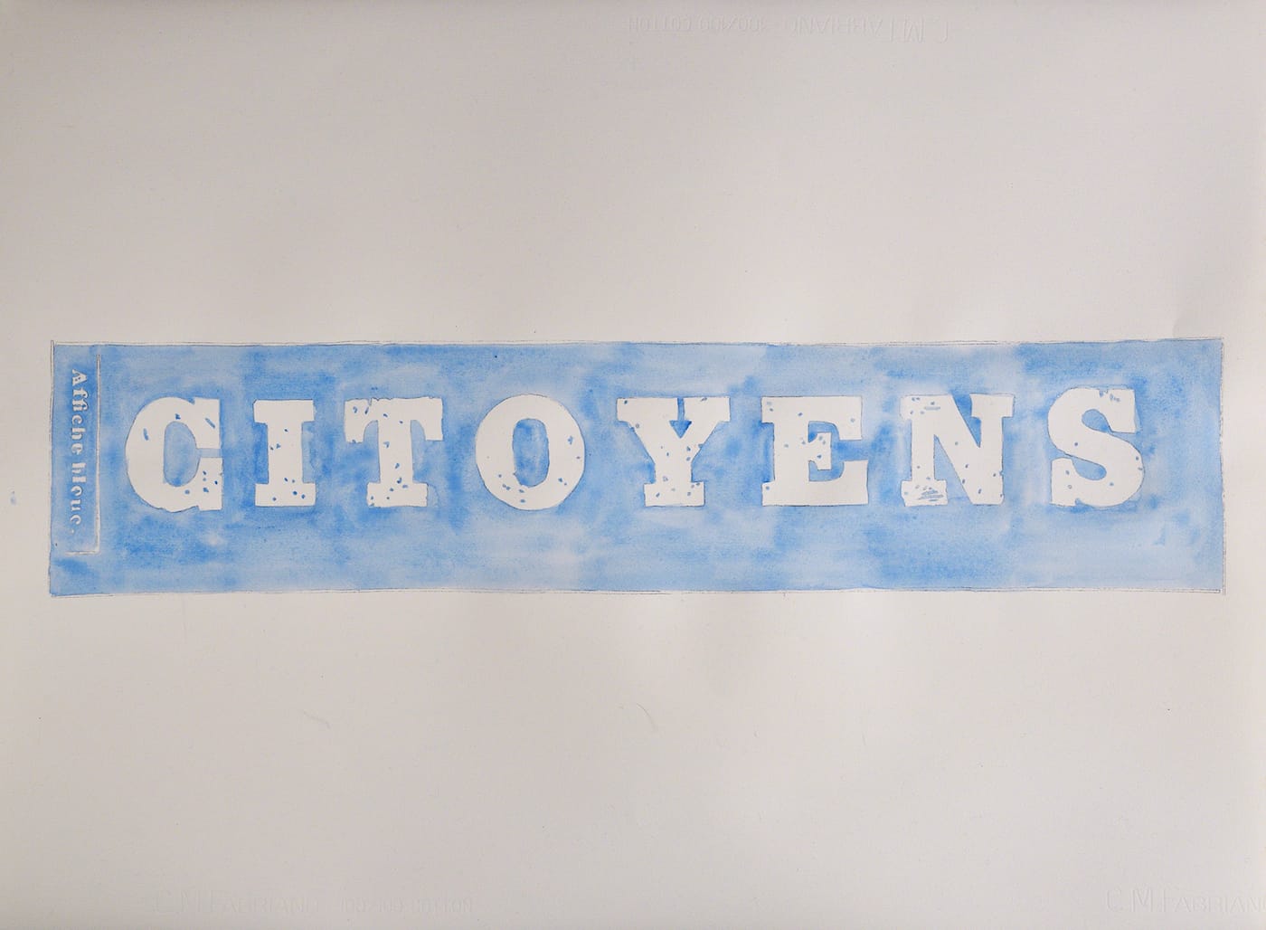 During their brief 1848 uprising the revolutionaries produced hundreds of posters and manifestos that were flyposted to building walls. Remarkably, these were collected a few years after the fall of the Commune and published in facsimile as Les Murailles Révolutionnaires (1851). This watercolor, Citoyens, reproduces a detail from one of those posters.