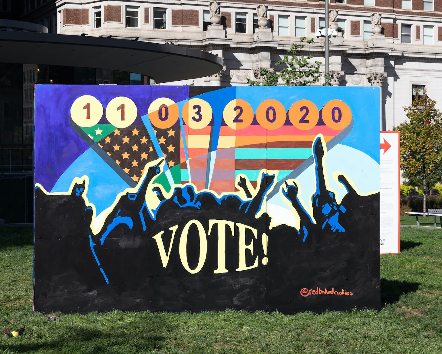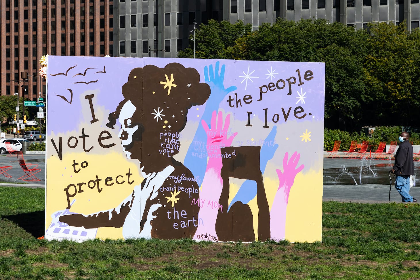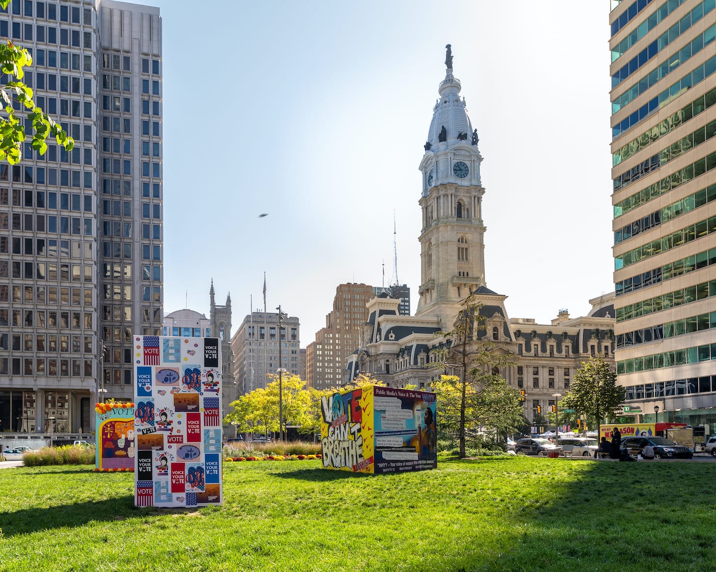Artists all around the United States are doing their best to inspire people to vote, designing everything from large city billboards to catchy images that are downloadable at home. In Philadelphia, artists have erected brilliant murals in the middle of John F. Kennedy Plaza (better known as LOVE Park, after Roberta Indiana’s sculpture, which has graced the space since 1976). The nonpartisan initiative is run by Mural Arts Philadelphia, which is considered the nation’s largest public art program and has typically commissioned between 50 and 100 murals annually for the past 35 years.