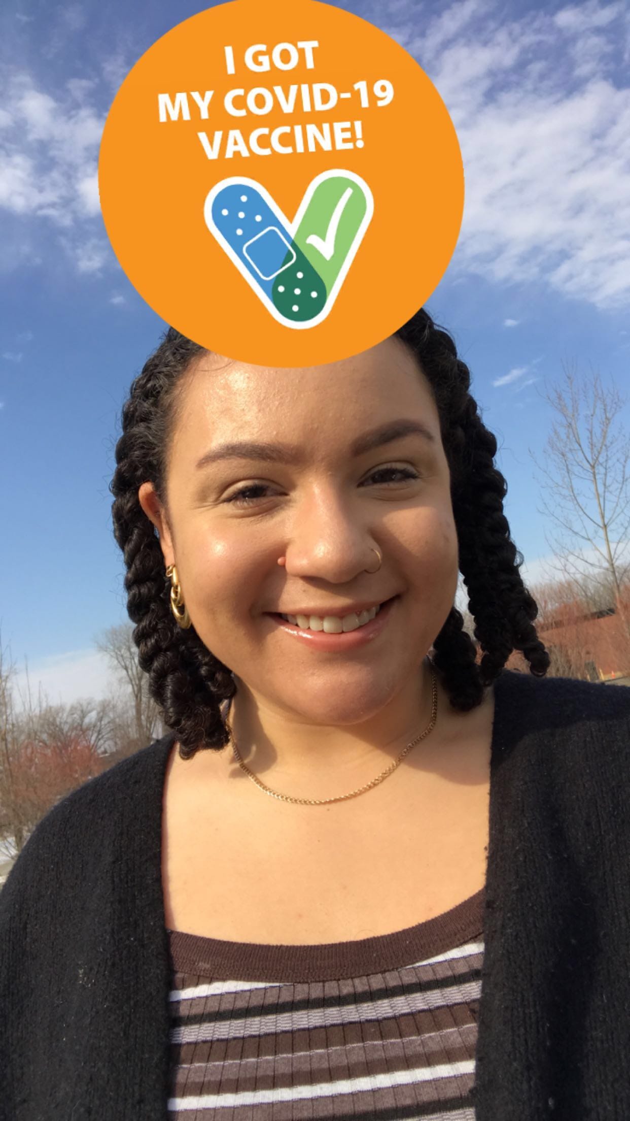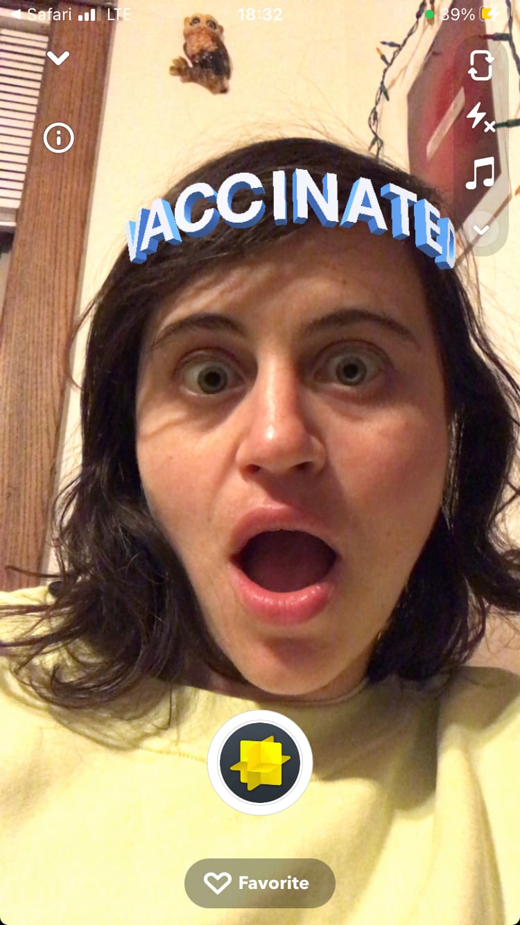 Later, she used the Snapchat vaxx lens, created by Minneapolis-based artist Mark Schoening, to further encourage people in her community to get vaccinated. He has three different lenses that people can choose from. A bouncing “jab” needle; an orange circular CDC sticker with a blue band-aid and green band-aid and text “I got my COVID-19 vaccine!”; and another sticker with just the scrolling word VACCINATED.