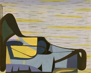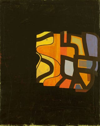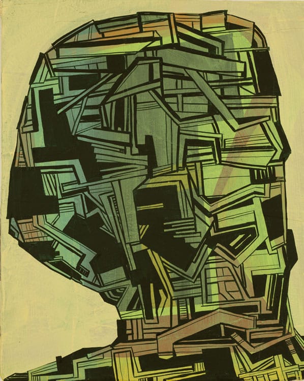 In “Mini Moog” (2012) — the painting’s title brings to mind Robert Moog, inventor of the Moog synthesizer — the interior of a head-like form is filled with abstract geometric shapes that shift between flatness things and jumbled perspective. Again, a jigsaw puzzle comes to mind, but one made from mismatched puzzle parts forcefully jammed together. At the same time, the abutting and seemingly overlapping sections suggest an aerial view of piles of collapsed houses or cross-sections of same. The head-like shape seems robotic and remote, as well as wounded and covered with patches. At his best, Burckhardt is able embrace both the abstract and the representational is such that we must read the paintings in different, often contradictory ways without ever reaching a conclusion.