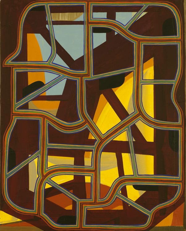 In “Economy Skeleton” (2012), Burckhardt has layered together overlapping configurations of shapes, varying from wide to thin, light to dark, and from yellow to dark brown. The final layer is a skeletal framework made up of thin, curving lines of different colors, including orange, green, blue, and umber. If we take the title, “Economy Skeleton,” at its word, its competing layers could be seen as underscoring the constant tension between contingency and independence running through American political discourse.