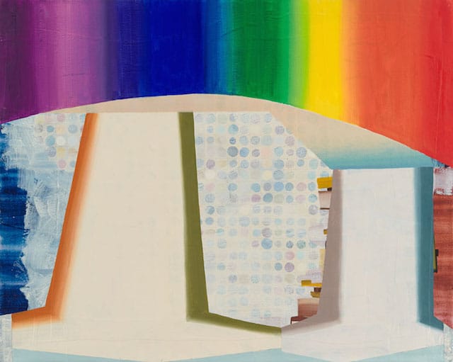 In “The Incredible Think” (2015), Burckhardt’s placement of a reddish band with diagonal struts along the painting’s top edge suggests the stretcher bars of a painting. Are we seeing through the stretcher, or are we looking at the back of a stain painting? What about the form in the foreground, which is made of colored rectangles outlined in black, most of which are a shade of green? Is it an escapee from Michael Bay’s film Tranformers (2007)? What about the building-like facades behind and below the robot-like structure?