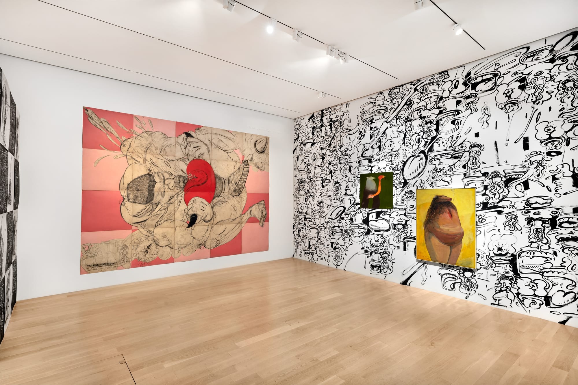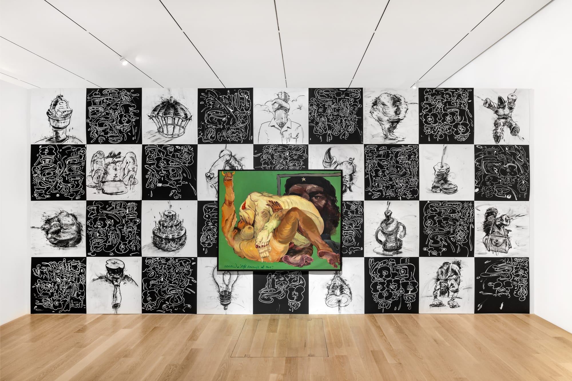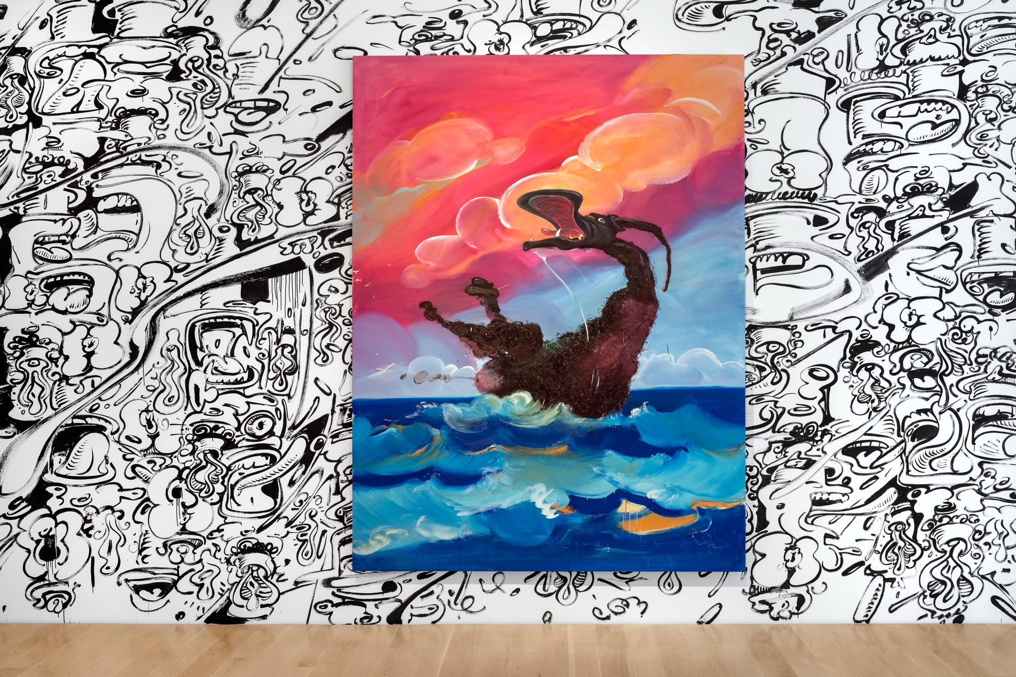 MIAMI — In Tomás Esson’s first solo museum presentation, the painter’s fleshy, anthropomorphic bodies emerge from more of them: a newly commissioned mural, “Wet Wall Drawing at ICA” (2020), spreads across a gallery-length wall and frames works like “Retrato #29 (Portrait #29)” (1998), in which a bovine creature leaks, lactates, and bellows. In a recent interview, the Miami-based artist discussed the mural’s significance, the way it highlights “the five fundamental elements of life…the vagina, the breast, the mouth, the penis, and the anus.” It’s a whirling gyroscope, in black gesso, of tongues, butts, spillage.