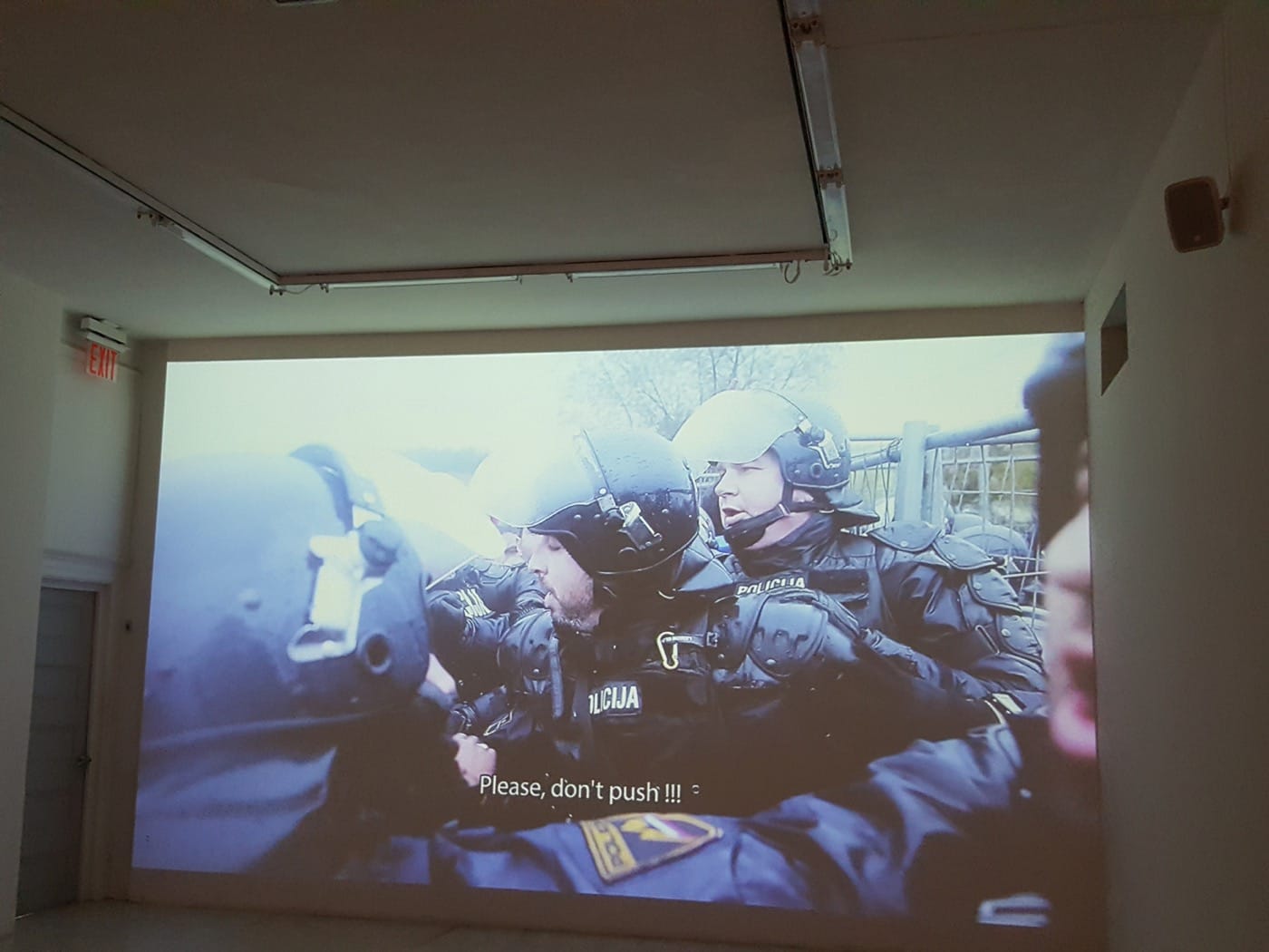 The scene is at once similar and atypical of the many that compose Rafa’s arresting, urgent work — the main component of a two-room exhibition of reportage from the frontlines of Europe’s reckoning with its “others” — which is to say, a reckoning with itself. Part visual ethnography, part war reporting, Rafa stages this human drama as a series of short, cinema-verité-style fragments compiled into a long film that lasts over an hour, as well as a series of shorter films which play simultaneously in an adjacent room. The use of a handheld camera gives the footage a visceral intensity that is hard to stomach for the duration — deafening explosions of teargas, smoke, chants, and bellows bleed into each other, echoing through the gallery space, creating an experience that is fittingly chaotic.
