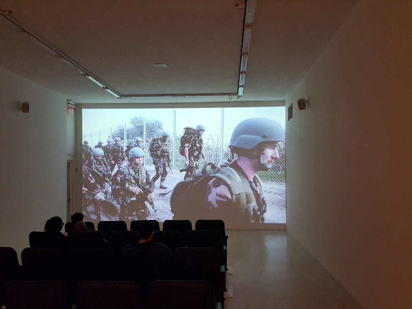 Nile Davies: About halfway through Tomáš Rafa’s “New Nationalism in the Heart of Europe” (2015–2016), at the edge of a forest on the border of Hungary and Croatia, a family ambles down the center of a train track, through thick mist and mud, the rails receding and narrowing until their distant vanishing point. Women, children, and men amass, carrying bundles, backpacks, and babies, lining up to get into vans to go somewhere unspecified. Their presence seems precarious here, unwelcome. Soldiers — not police — arrive. A huge military apparatus: trucks, camouflage, deadly weapons. They seem ready to fight an army — but who? Trains sit idly on the landscape, closely watched. Barbed wire fences are unrolled like sheets of aluminum foil, marking the transparent frontier at which point the strangers can go no further. A sea of bodies surges against the steel netting. The volume swells to deafening: voices of the very young and very old. A din of screams and crying. Someone’s mother appears to be drowning in the crush. “Please don’t push,” a soldier begs, politely through the fence.
