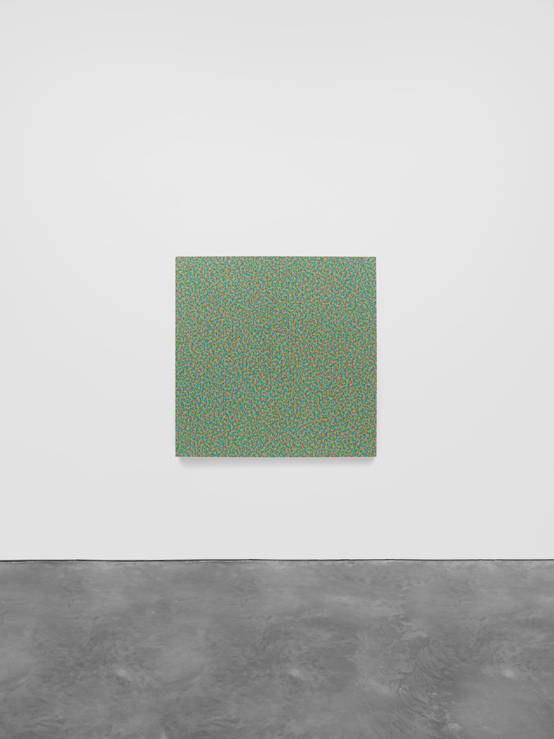 Although I knew of Bechara from conversations I had with Wurmfeld, I was not prepared for what I encountered in his self-titled debut exhibition at Lisson Gallery. Working in acrylic on square canvases ranging from 24 by 24 inches to 61 by 61 inches, he divides the entire surface into quarter-inch squares in which he paints one of 28 colors. The colors can shift tonally or sharply. By taping off each vertical line of squares after he has carefully filled every one in, he seamlessly combines rigor and randomness. The result is dazzling, engaging, and unsettling, since it undermines any sense of stability that we associate with a grid. It is the latter aspect that I think is the artist’s contribution to optical, perceptual painting.