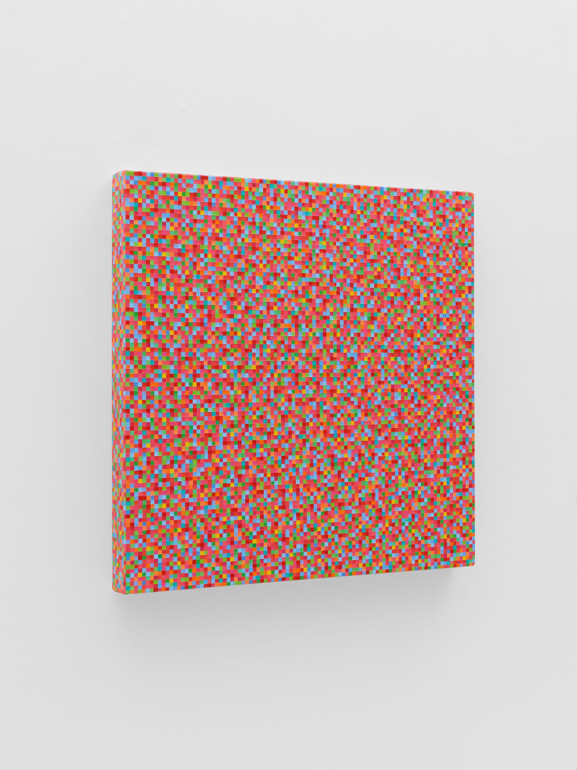 While all of the exhibition's seven paintings dated 2023 have a 28-color palette, each one is rendered in a specific set of colors, indicated by the title. (The show also includes one painting from 1979.) For example, the proportions of one color to another can change, as in the identically sized “Random 28 (Red version)” and “Random 28 (Green version).” This phenomenon is evident at a considerable distance from “Random 28 (Red version),” yet as you move closer, the blues, greens, yellows, and oranges become more assertive. The red remains dominant, but not as decisively.