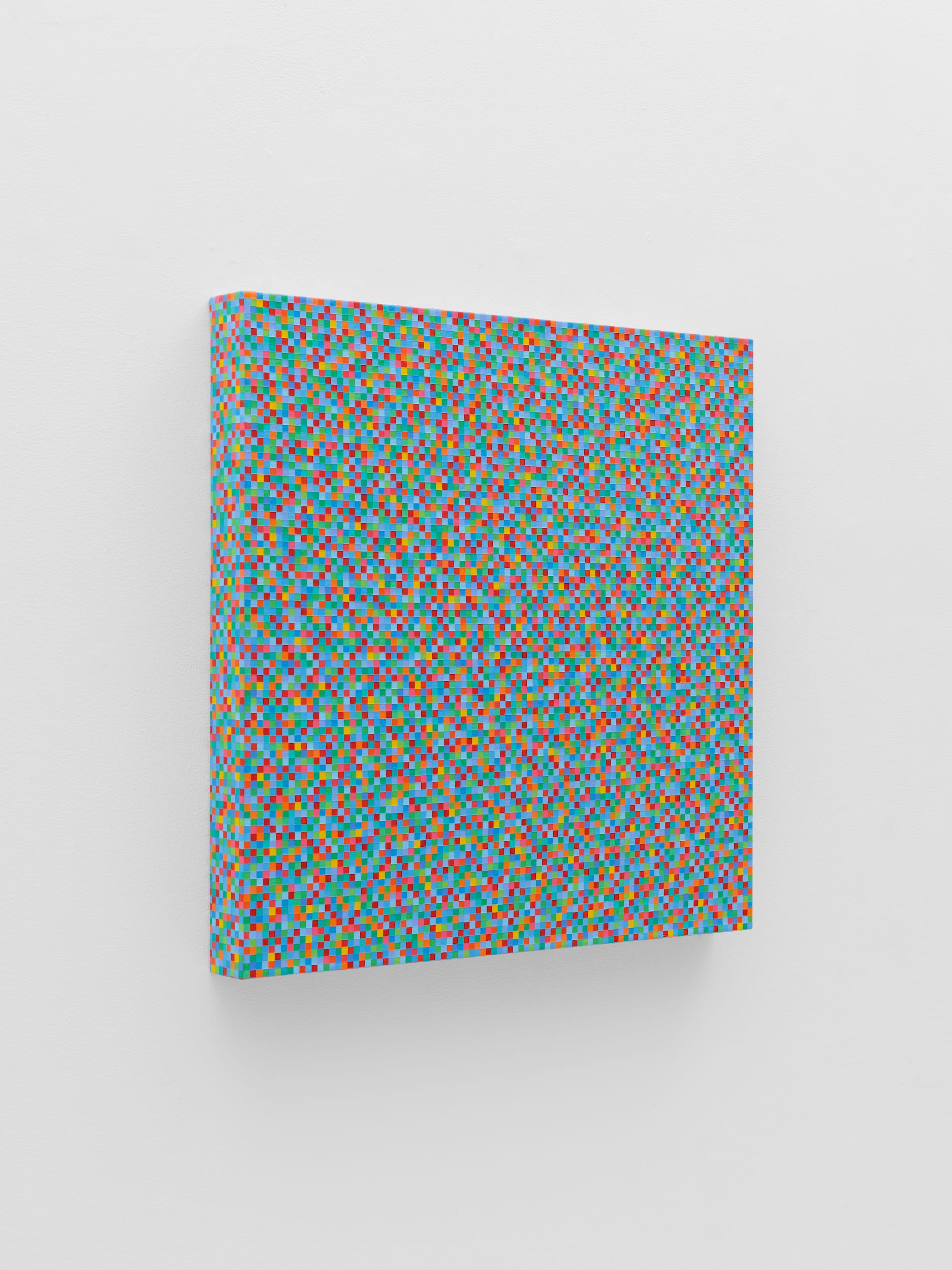 The sheer number of squares in each painting, and the range of colors Bechara achieves with a predetermined palette, is likely to bring computer screens and pixels to mind. However, his colors and hues are of various saturations. In contrast to most painters interested in color and perception, his paintings are cacophonous, almost shrill. Their lack of order may not be comforting, but it seems very true to our current world situation. Change and rupture are embedded within the works. In those he’s done a on a deep stretcher, the painting continues around the sides, making it clear that we cannot see the entire work at once, refuting the principles of Minimalism.