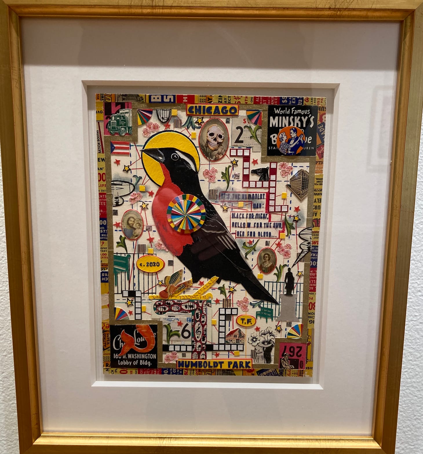 But Fitzpatrick’s works are more than just portraits of beautiful birds. In a Window To The World (WTTW) interview, Cleve Carney Museum of Art curator Justin Witte said, “His works are very layered collage pieces, and that layering contains a lot of different elements that replicate the layering you experience in the city — the different cultures, the sounds, the snippets of poetry and language.”