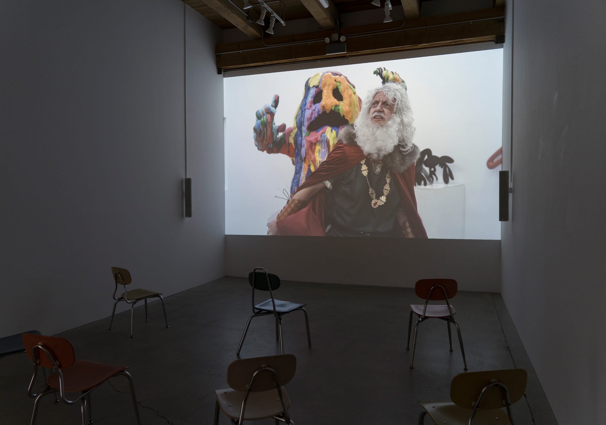 Blow, winds, and crack your cheeks! is named for a line spoken by King Lear in the Shakespearean play. The phrase begins a monologue, the entirety of which Tasset delivers in a five-minute video, that ends with the line, “I am a man more sinned against than sinning.” Directed by Jennifer Reeder, “My Lear” (2025) features the artist fully costumed as a mad old king, ranting and raving in his studio, overstuffed with past artwork, presumably unsold. Cue the obvious parallels with kingdoms, daughters, and hangers-on.