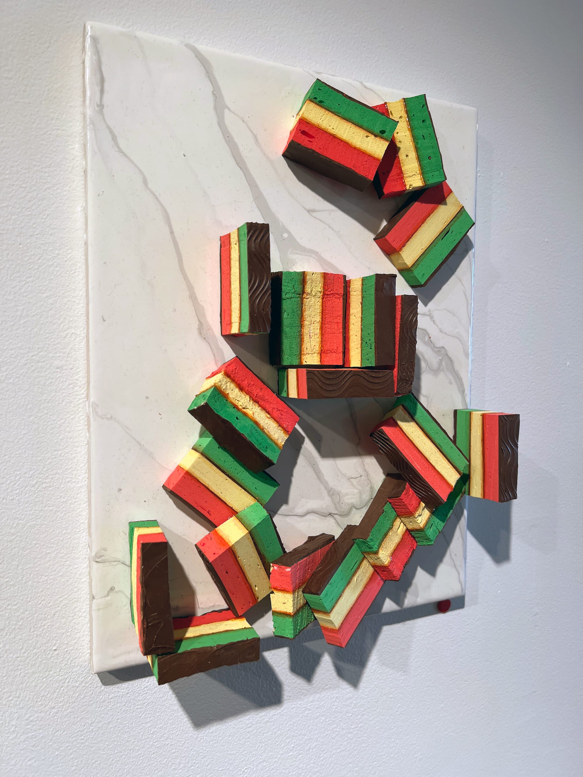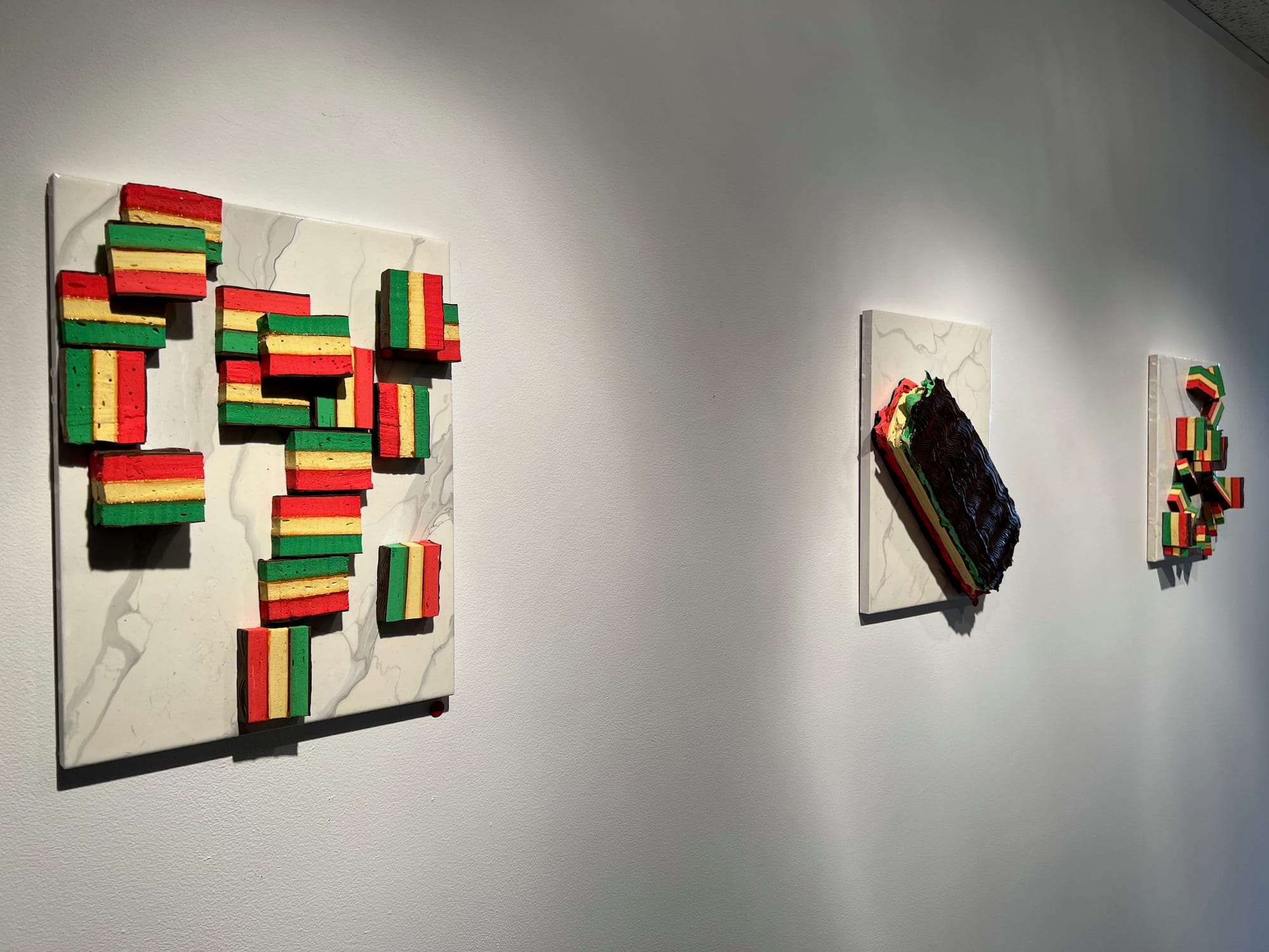 But it is in the hallway, which bridges the front and back galleries, where the most complicated works appear. In "Untitled I—III" (2020–21), Avelluto has taken the trompe l'oeil tradition into new directions, using acrylic paint he has created the rainbow cookies that are so convincing it takes a while to clearly see the artifice. Placed on boards with faux marble-painted finishes, they speak an American language of commercialism — like an advertising display — with the intimacy of immigrant hospitality and the excitement of stepping into a favorite bakery. Only at the edges of the board does the visual cleverness come into clear focus.