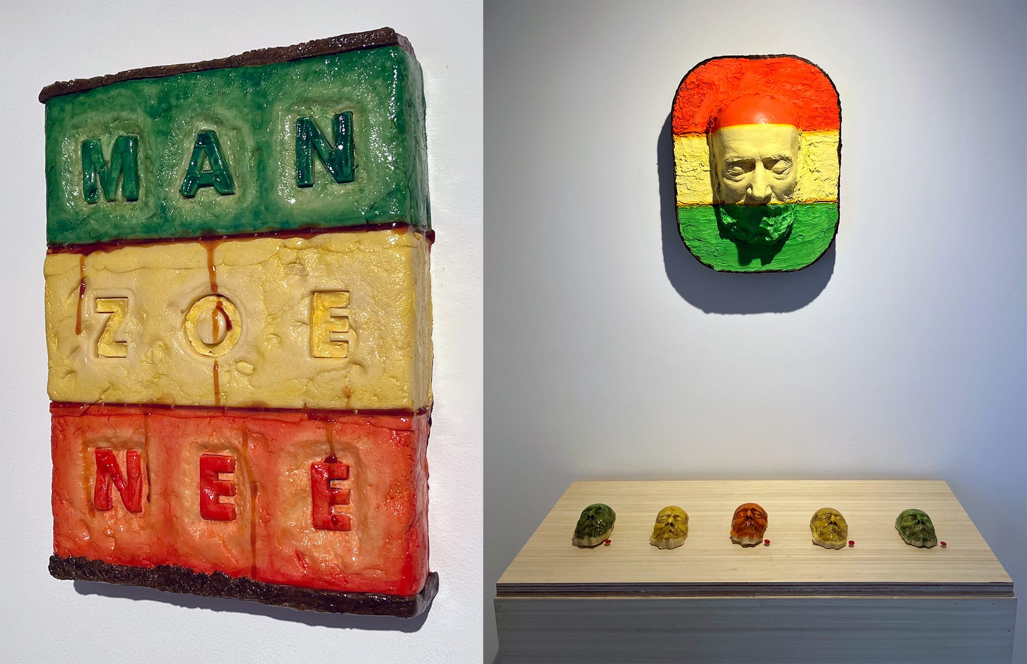 With this in mind, I visited John Avelluto’s curious exhibition at Bay Ridge’s Stand4 gallery that explores lesser-known aspects of Italian American history. In the front room, Avelluto employs the distinctly Italian-American rainbow cookie and overlays them with the Italian-American slang term “Foogayzee” (a phonetic misspelling of “fugazi,” meaning “fake”) in one instance and “Manzoenee” (a phonetic rendering of the name of iconoclastic Italian artist Piero Manzoni), in another. The former is an oversized rainbow cookie fashioned out of foam and acrylic paint, while the latter is made of marzipan and hangs on the wall with the clumsy delight that would fit perfectly into Pop artist Claes Oldenburg’s 1962 Store installation. Avelluto intends to invite friends and art lovers to join him in eating the marzipan sculpture when the exhibition ends.