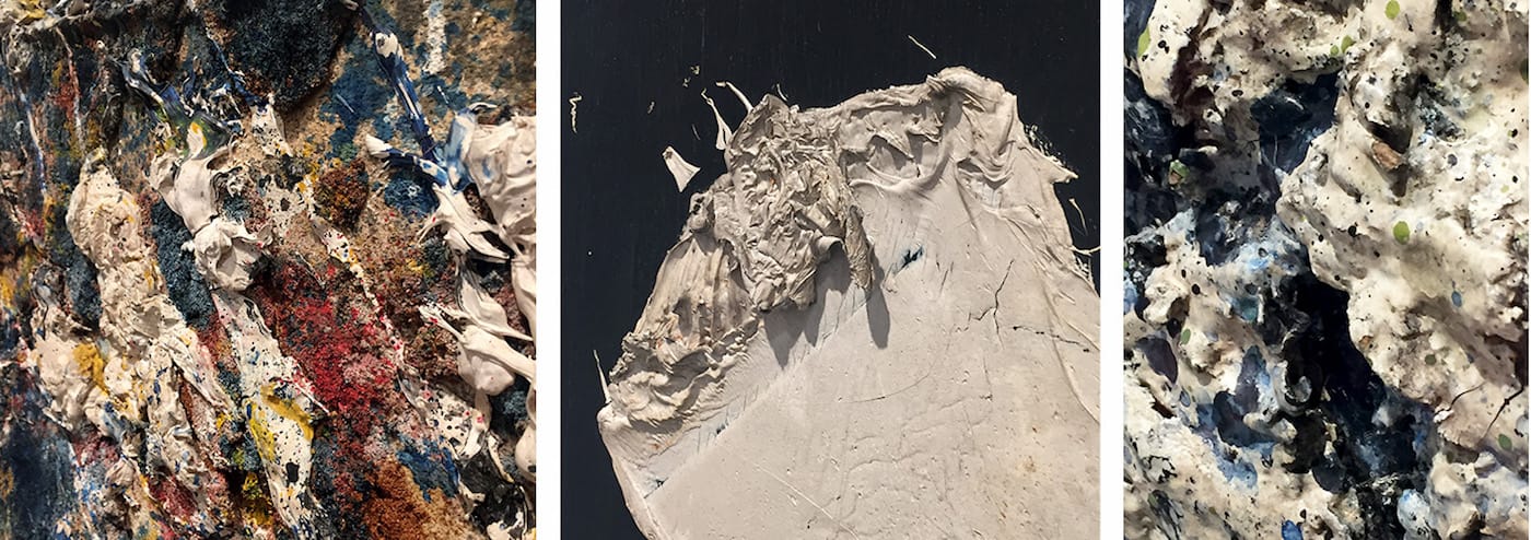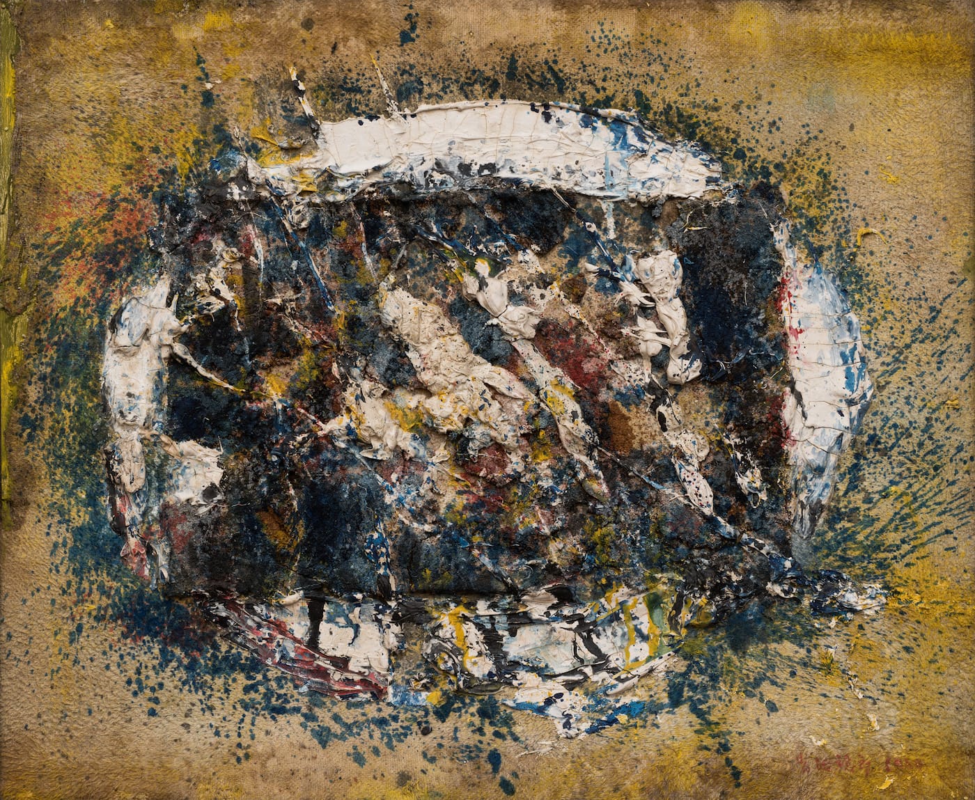 At McCaffrey, some of Yoshida’s most compelling works, which pulsate with raw energy, seem to reveal a latent, form-seeking impulse in the very materials of which they are made. These include such mixed-media paintings as “Sakuhin (61-10)” (1961) and “Sakuhin” (1963). Onto their surfaces the artist slaps layers of oil paint as thick as cake frosting, sometimes mixing them up with papier mâché to create goopy, creeping, multicolored crusts that evoke monster moss growing on otherworldly forest floors.