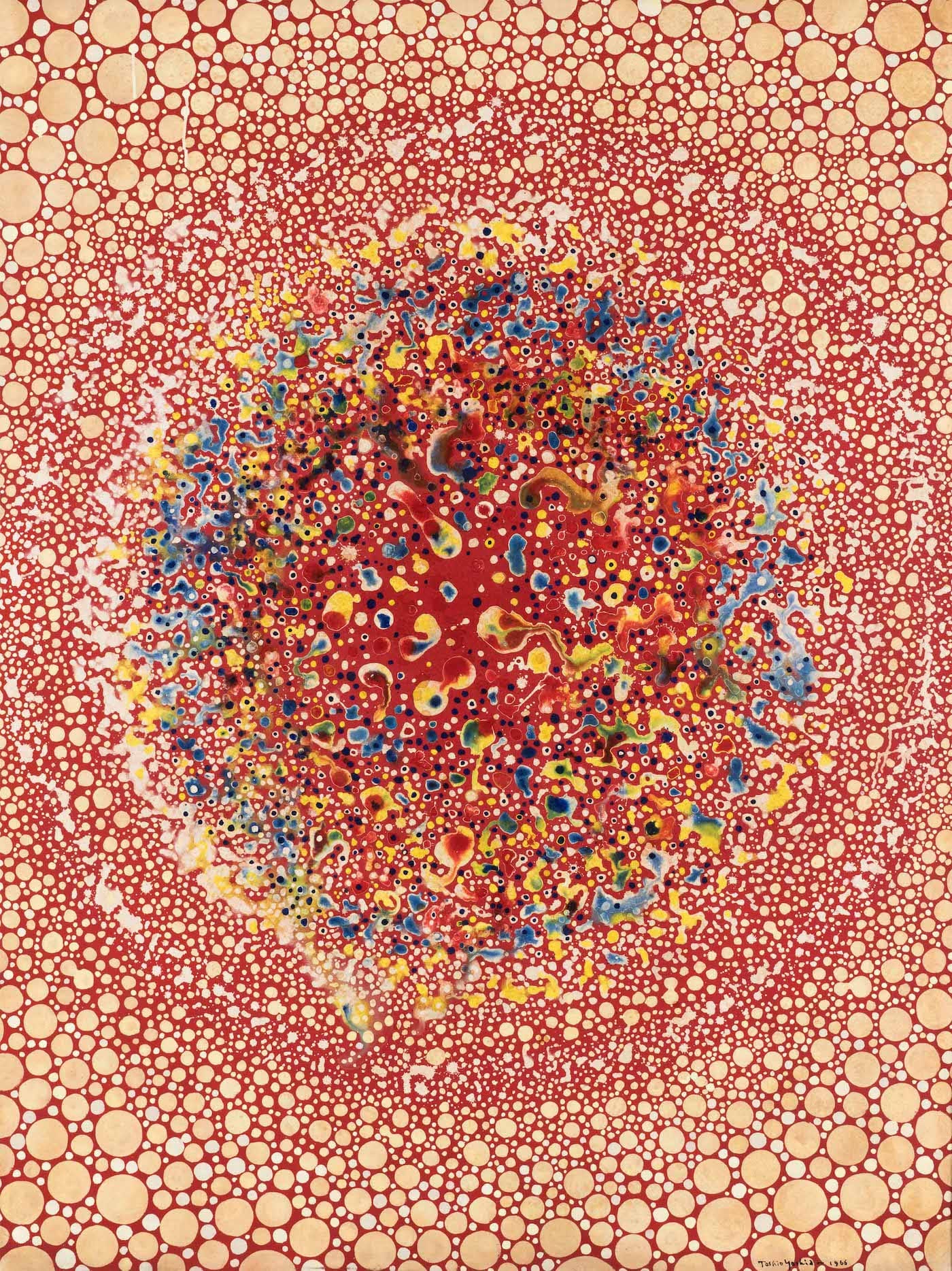 In the 1960s, Yoshida veered toward the psychedelic in oil-on-canvas paintings made of up masses of colored dots in circular compositions set against solid-color grounds or expanding clusters of ever-larger dots. The resulting images resemble abstract, animated mandalas or depictions of some kind of souped-up cellular mitosis on a celestial scale.